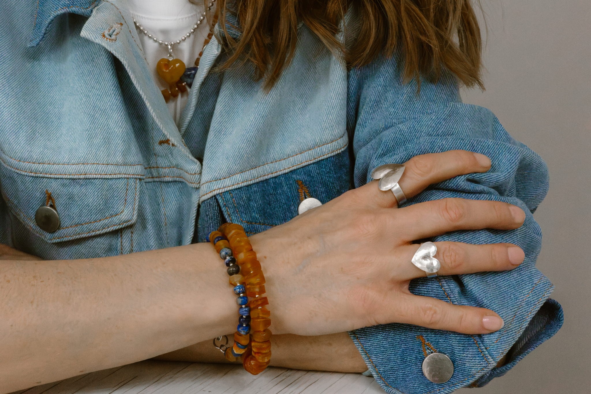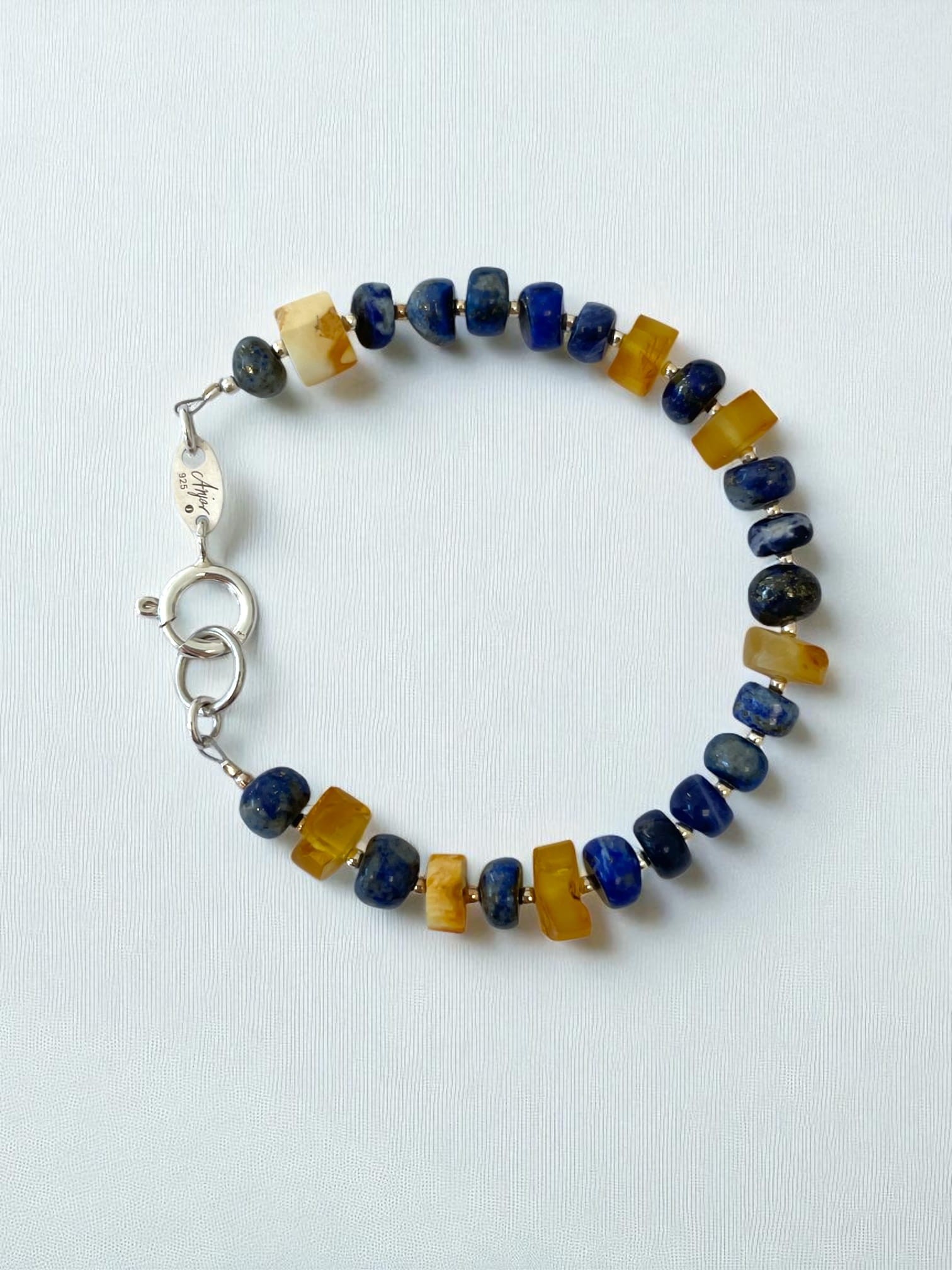 Wyjątkowa bransoletka wykonana z nieregularnych bryłek lapis lazuli oraz delikatnie oszlifowanego, matowego bursztynu bałtyckiego. Kamienie zostały przełożone srebrnymi, polerowanymi kuleczkami, dzięki czemu całość układa się miękko i elegancko na nadgarstku. Bransoletka zapinaną jest na klasyczne zapięcie typu federing wykonane ze srebra próby 925.