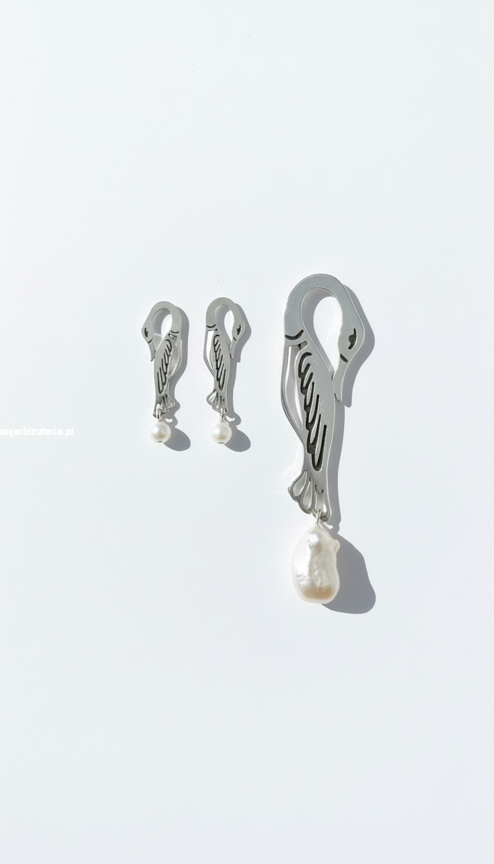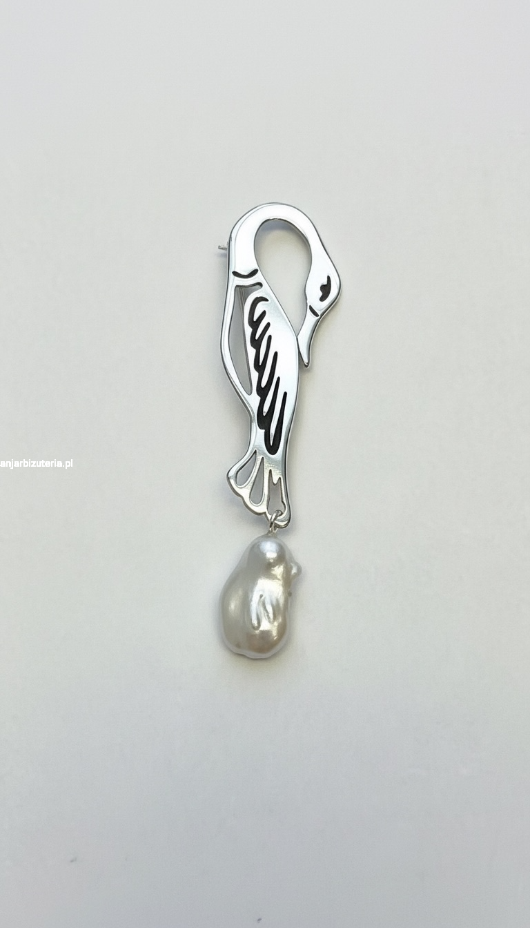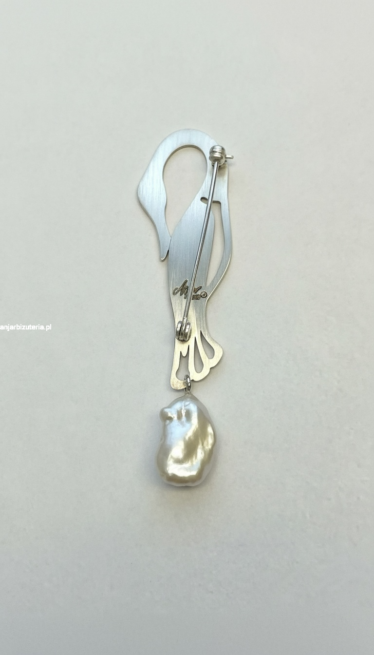Wyjątkowa, ażurowa broszka z białą perłą o długości ok. 7,5 cm., wykonana z polerowanego srebra próby 925. Ozdobiona, ażurowym motywem przedstawiającym żurawia, symbolizującego harmonię, wolność i elegancję. Precyzyjna forma nadaje broszce niepowtarzalnego charakteru i przyciąga wzrok swoim artystycznym wykończeniem.