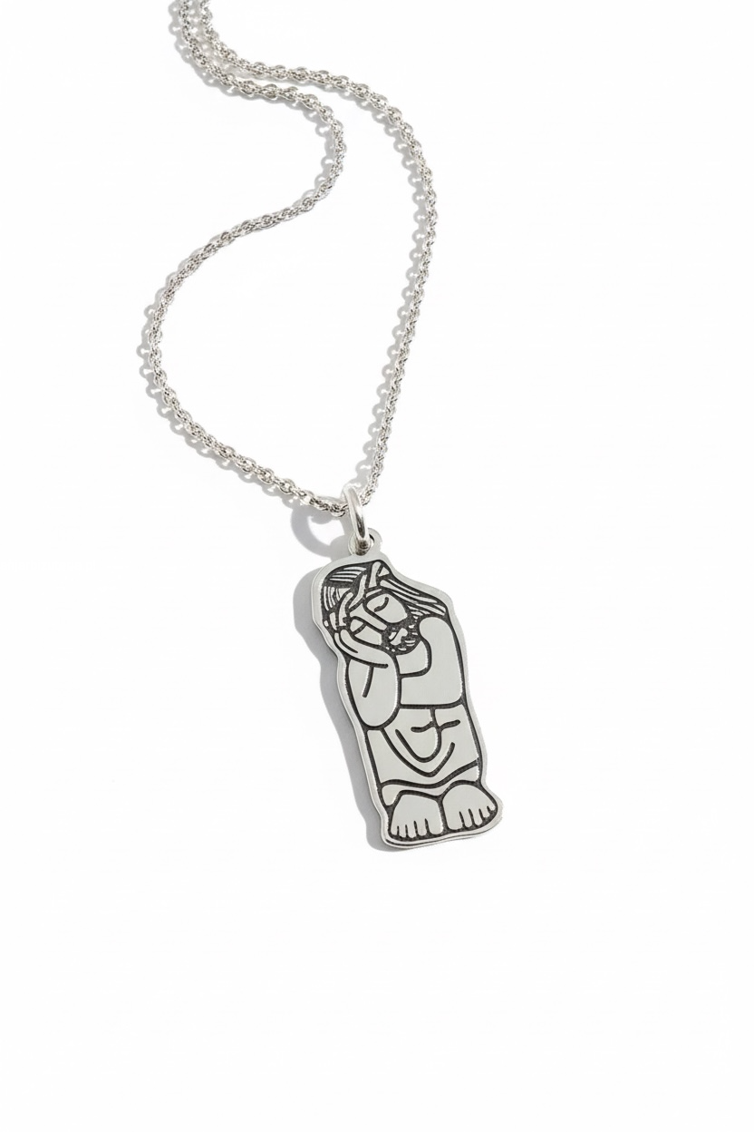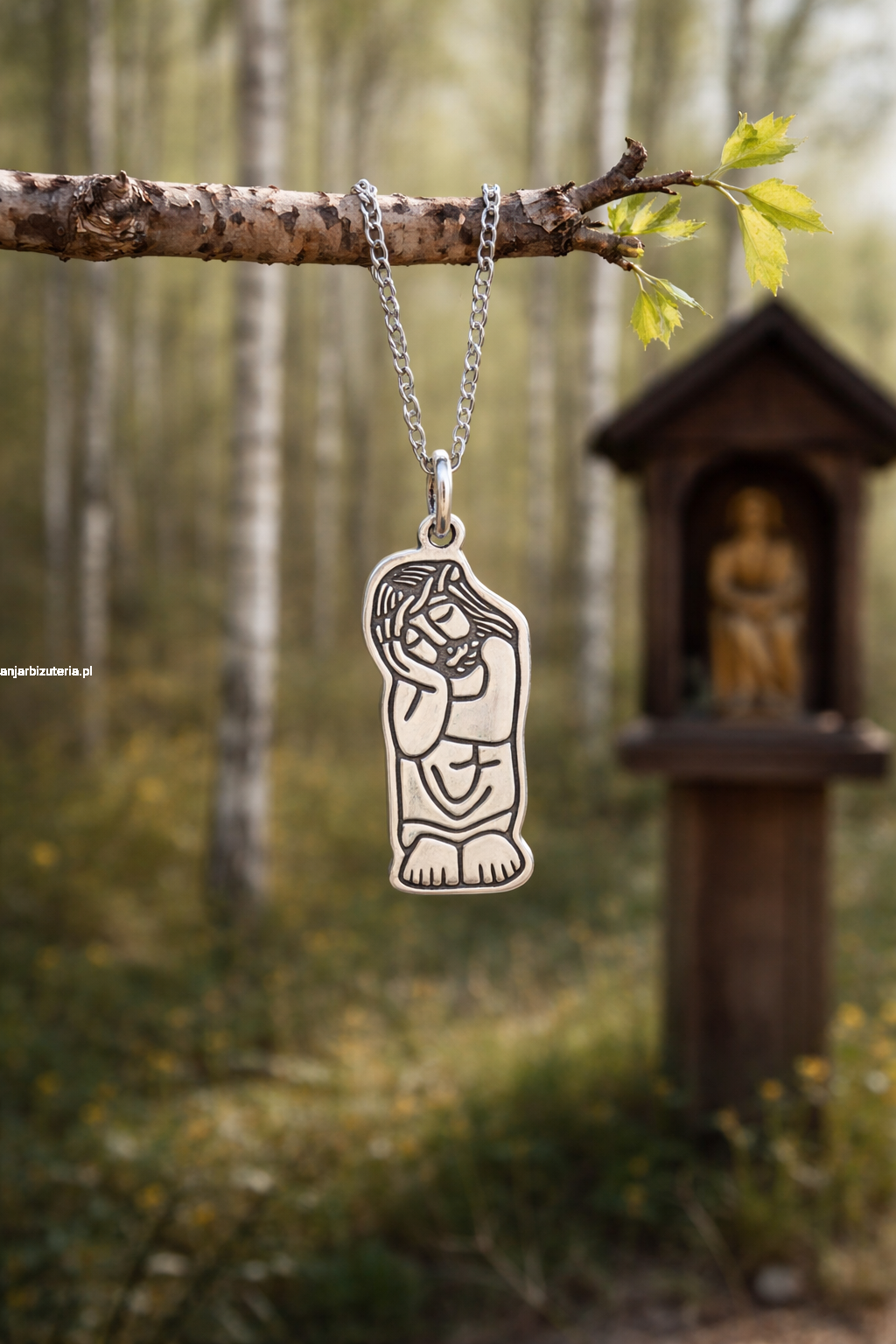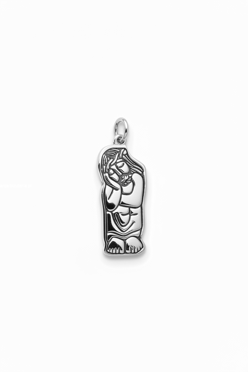 Srebrny medalik z wizerunkiem Chrystusa frasobliwego, inspirowany polską sztuką ludową.