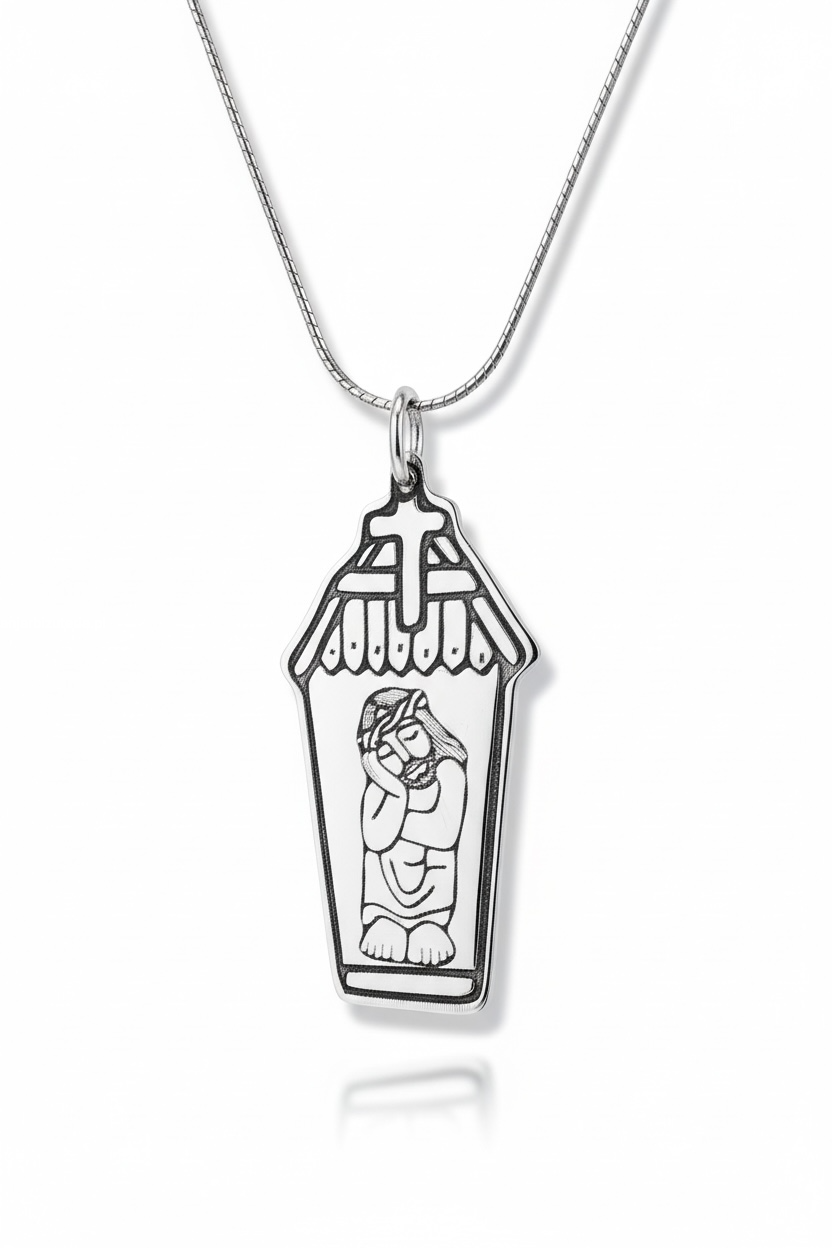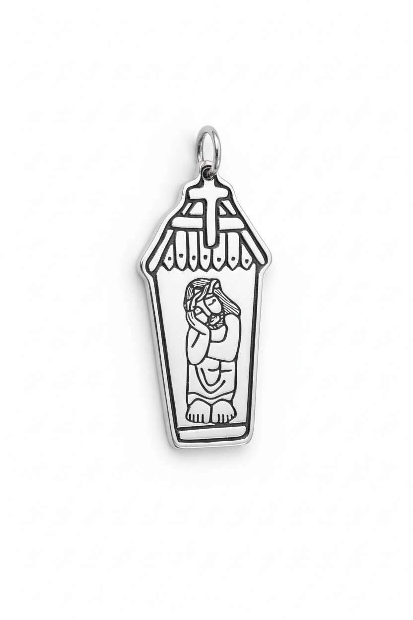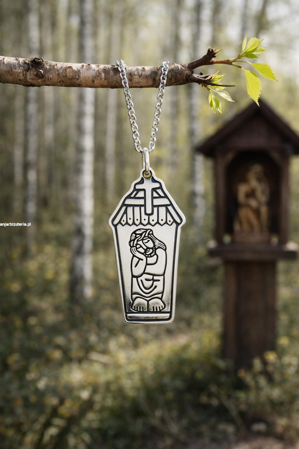 Srebrny medalik z wizerunkiem Chrystusa frasobliwego w kapliczce, inspirowany polską sztuką ludową.