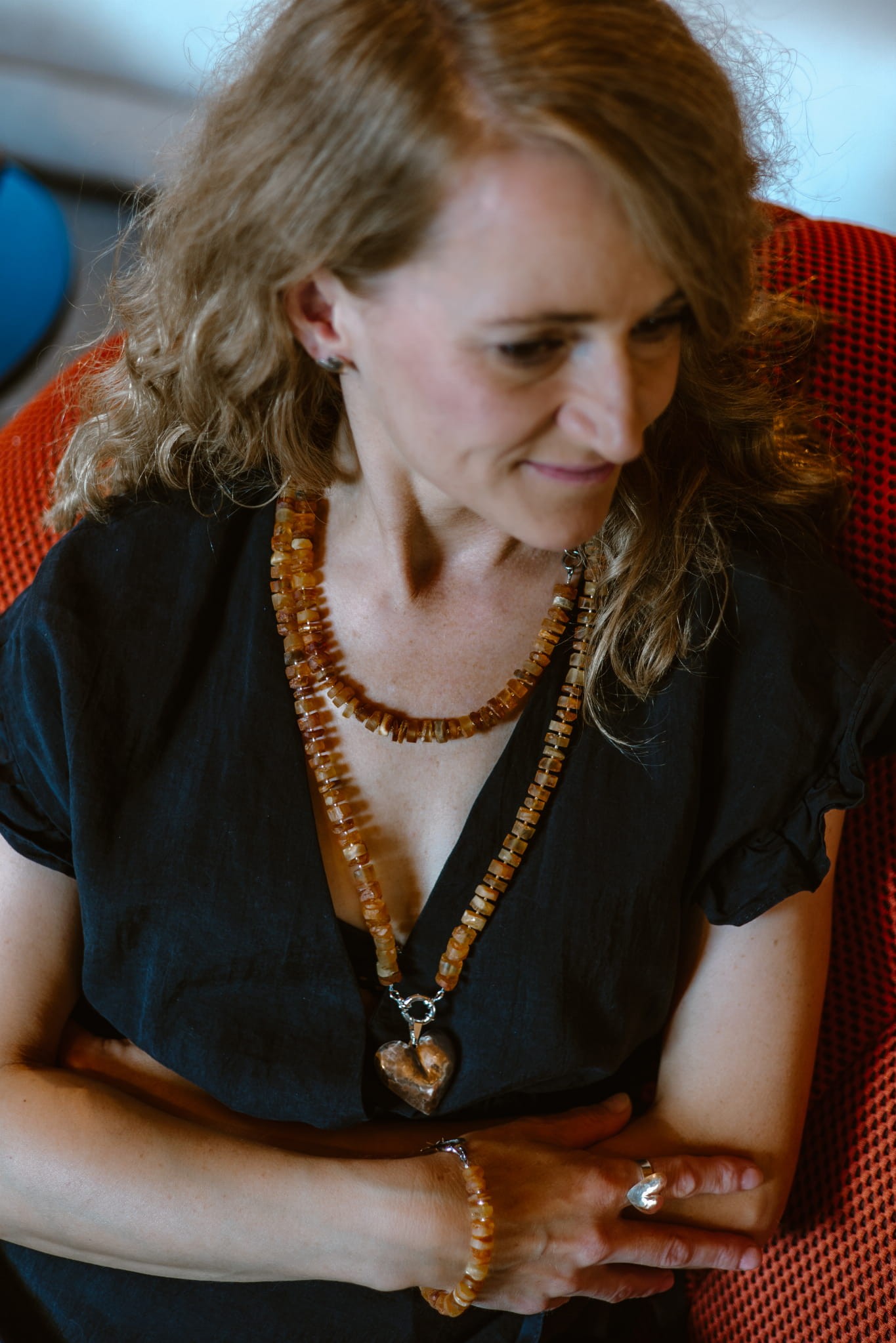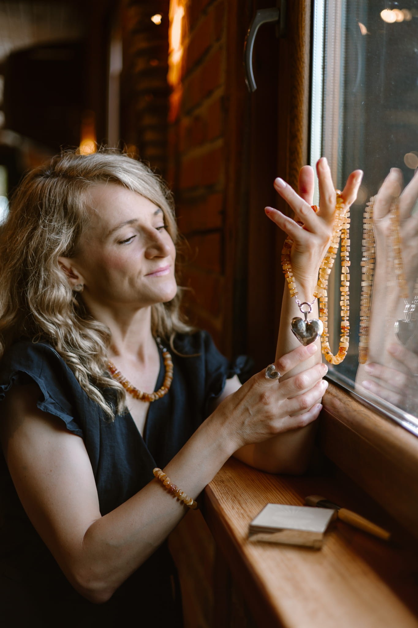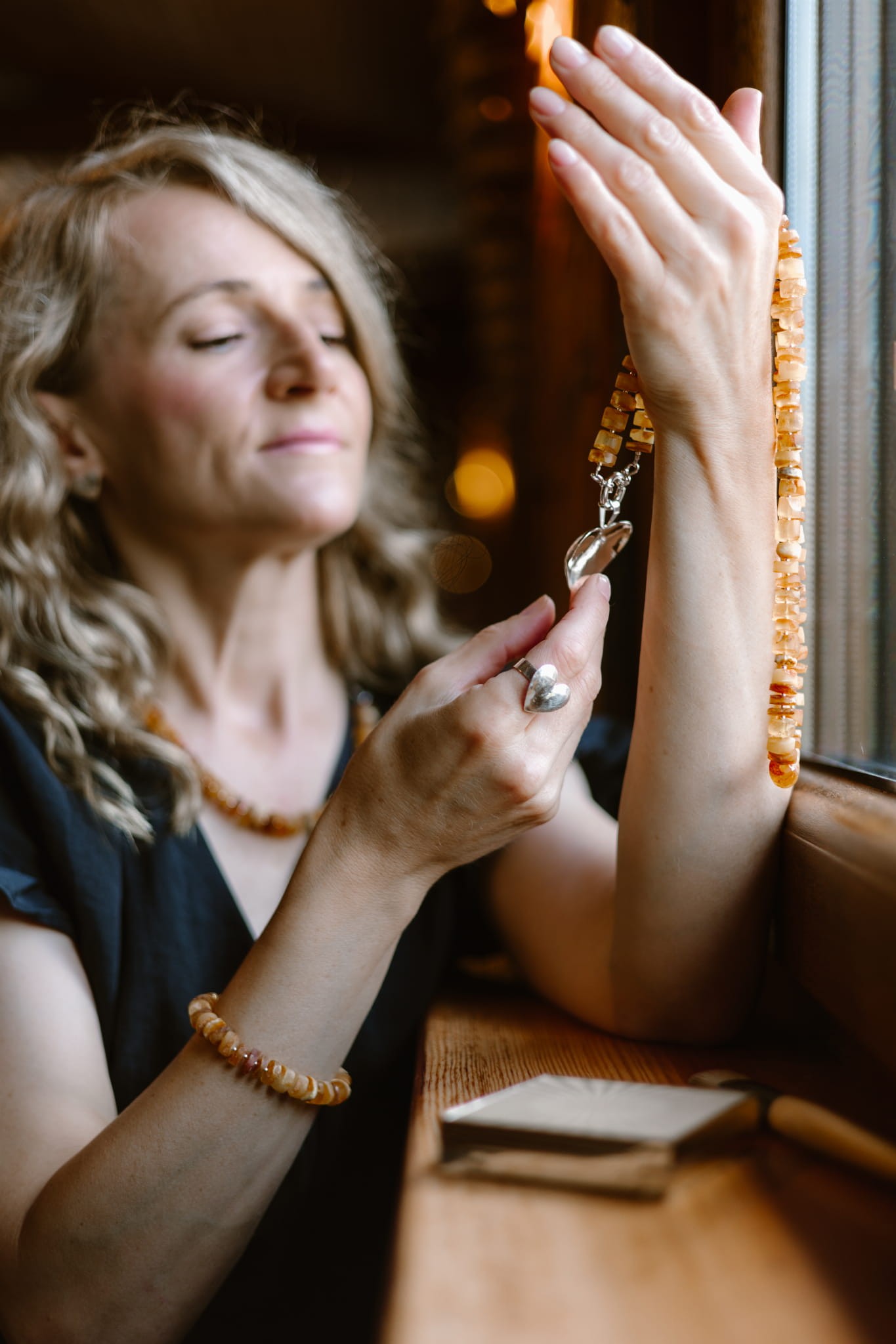 Wyjątkowy, długi naszyjnik wykonany z delikatnie oszlifowanego, matowego bursztynu bałtyckiego. Kamienie zostały przełożone srebrnymi, polerowanymi kuleczkami, dzięki czemu całość układa się miękko i elegancko na dekolcie. Naszyjnik zapinany jest na duże, ozdobne srebrne zapięci.