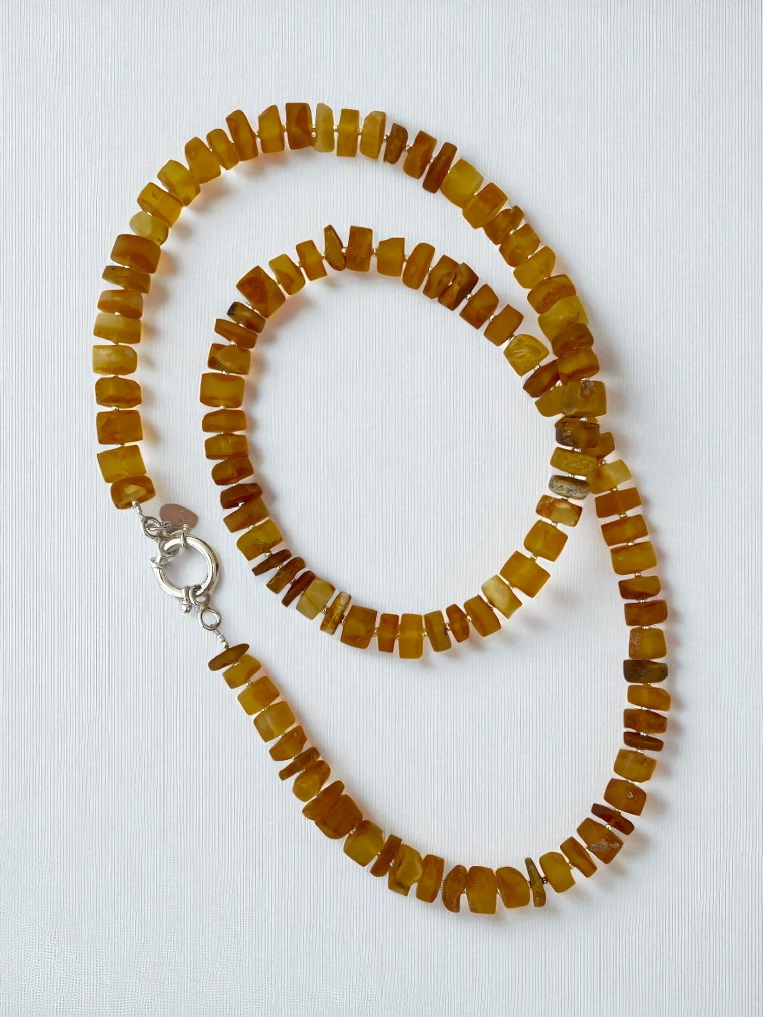 Długi naszyjnik wykonany z delikatnie oszlifowanego, matowego bursztynu bałtyckiego.