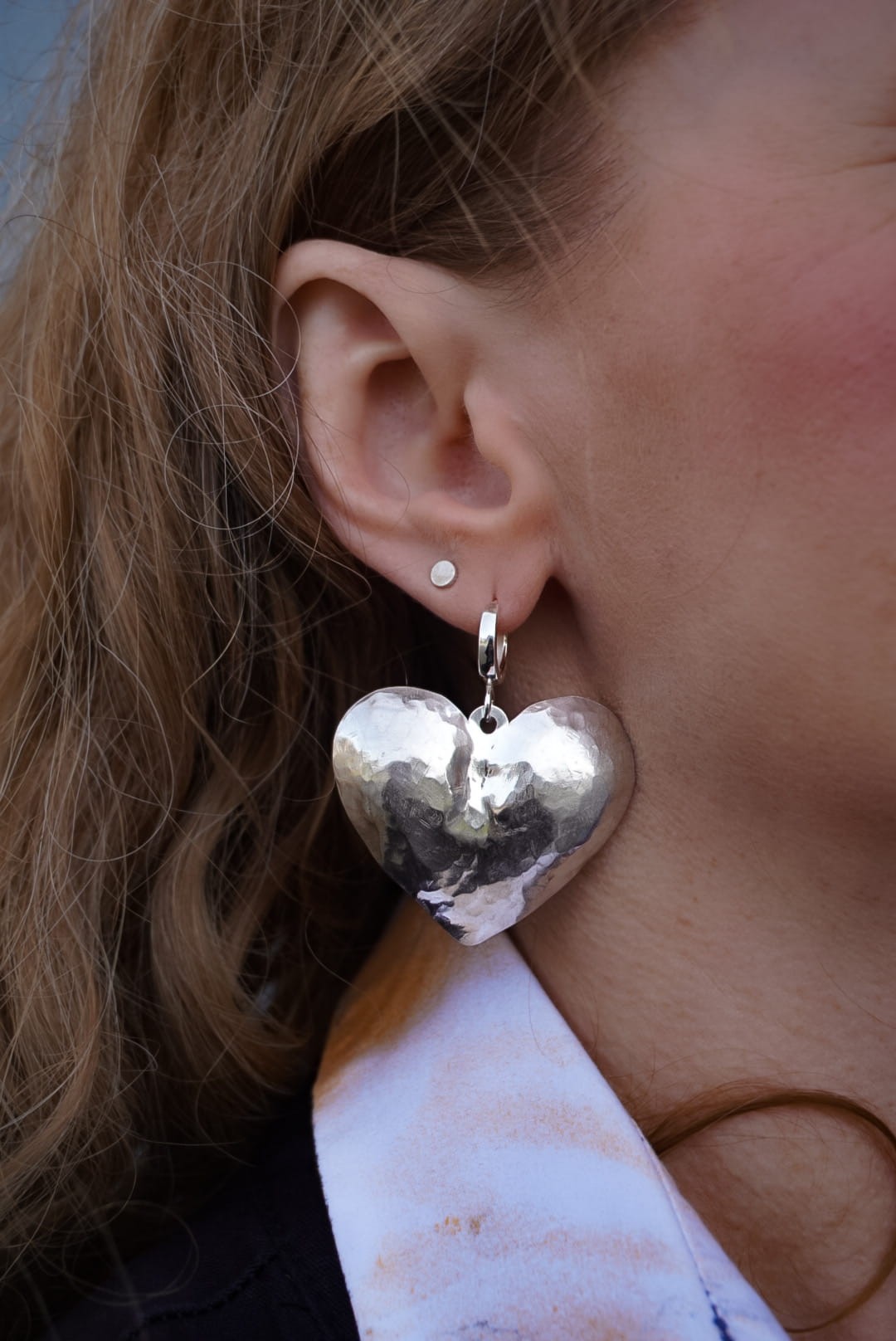 Wyraziste, a jednocześnie zaskakująco lekkie – te kolczyki w kształcie serc to biżuteria, która od razu przyciąga spojrzenia. Wykonane ręcznie ze srebra próby 925, młotkowanego i szczotkowanego dla uzyskania subtelnej, artystycznej faktury.