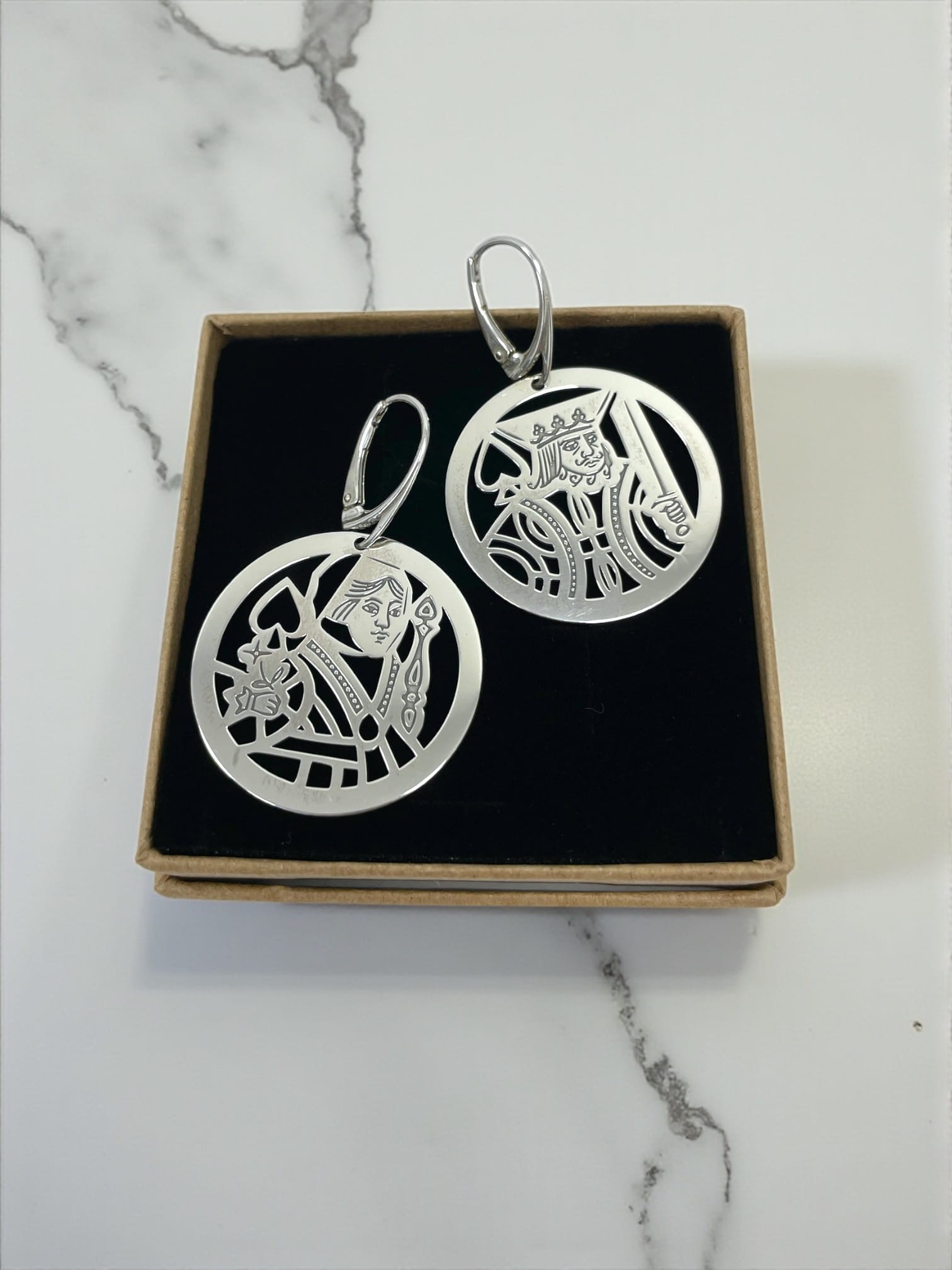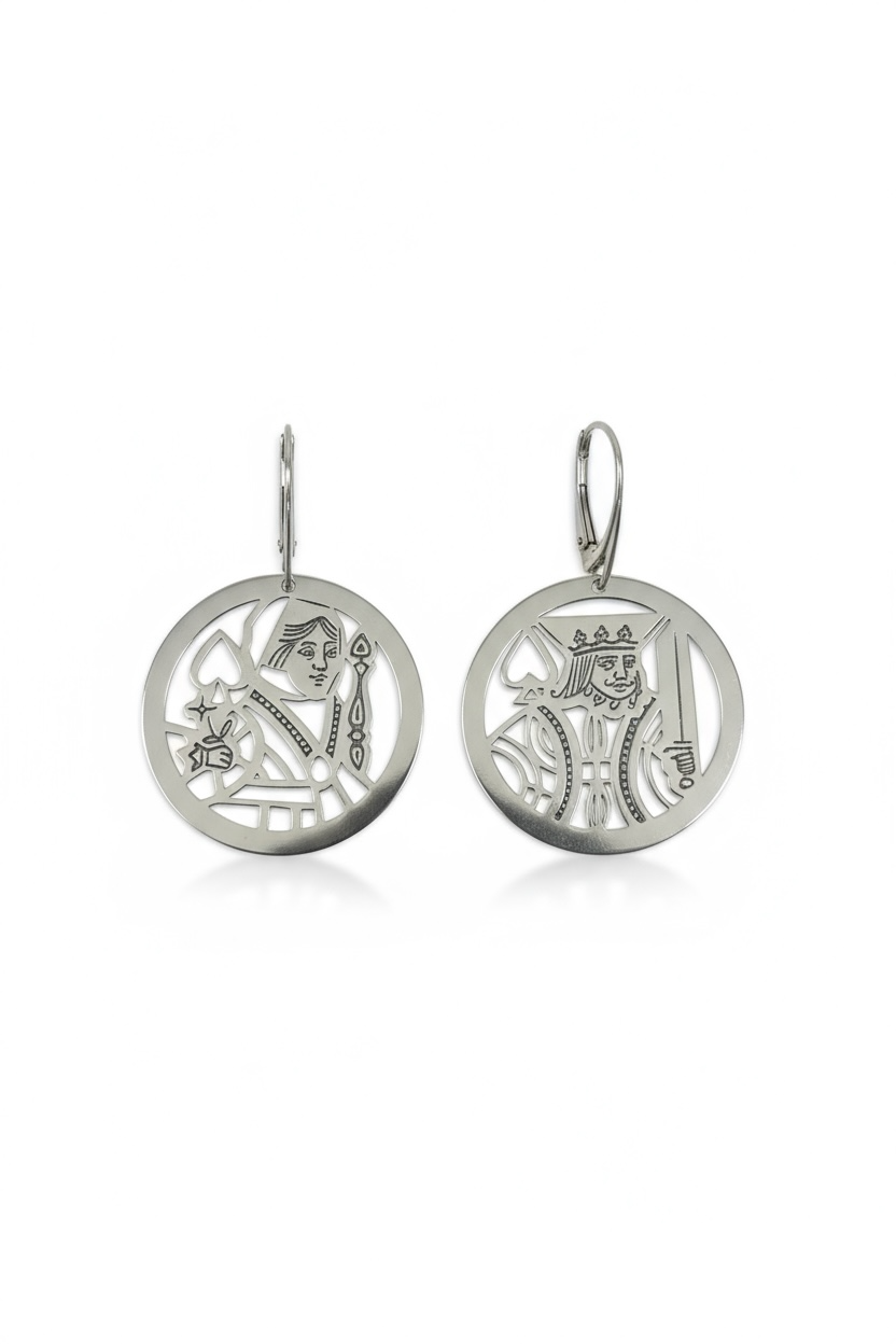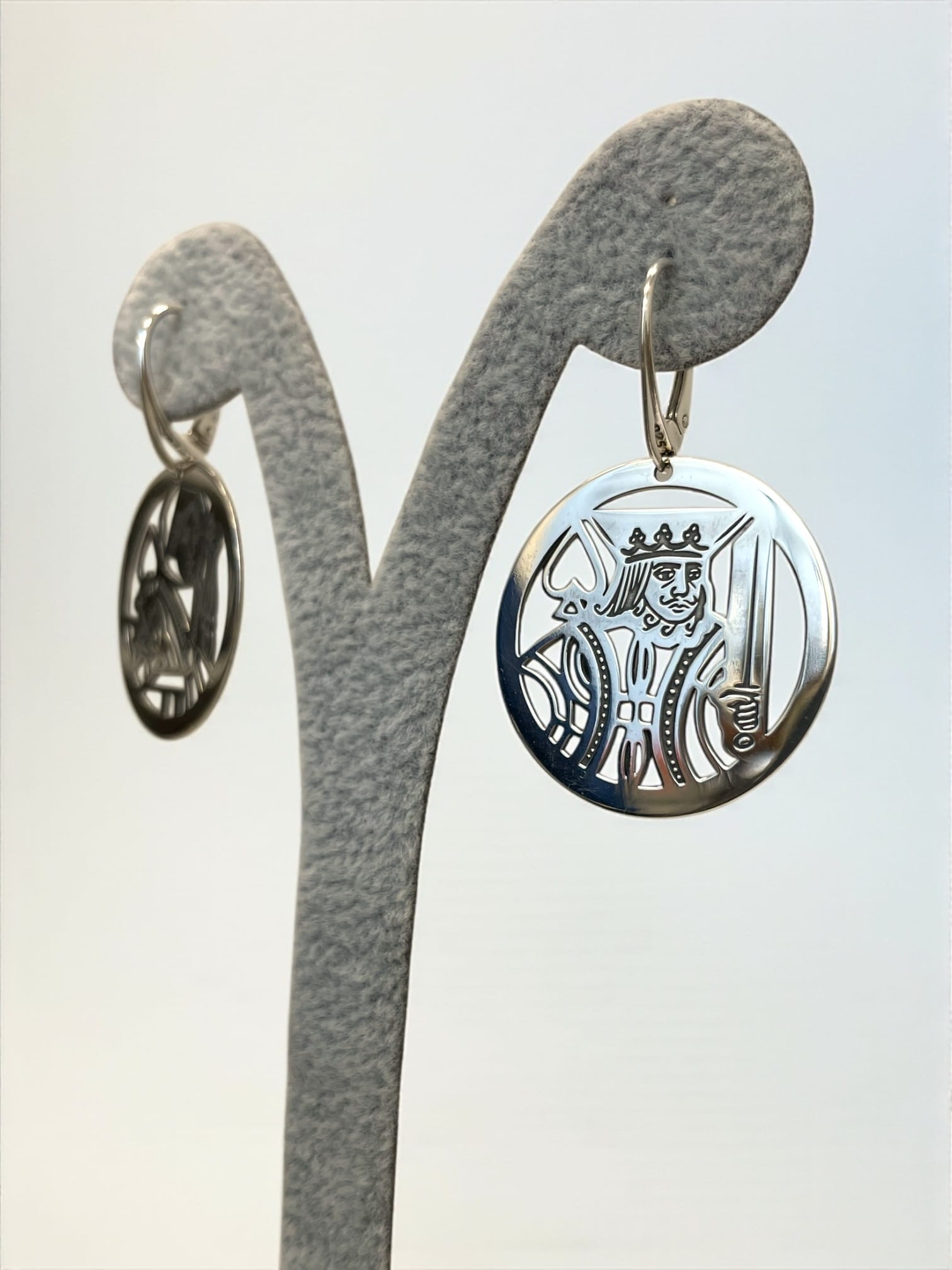 Duże, srebrne, ażurowe kolczyki z wizerunkami Damy i Króla pik. Pomimo swojej efektownej wielkości, są niezwykle lekkie i komfortowe w noszeniu dzięki precyzyjnemu wycięciu.