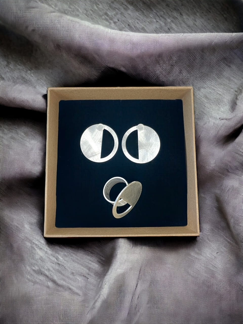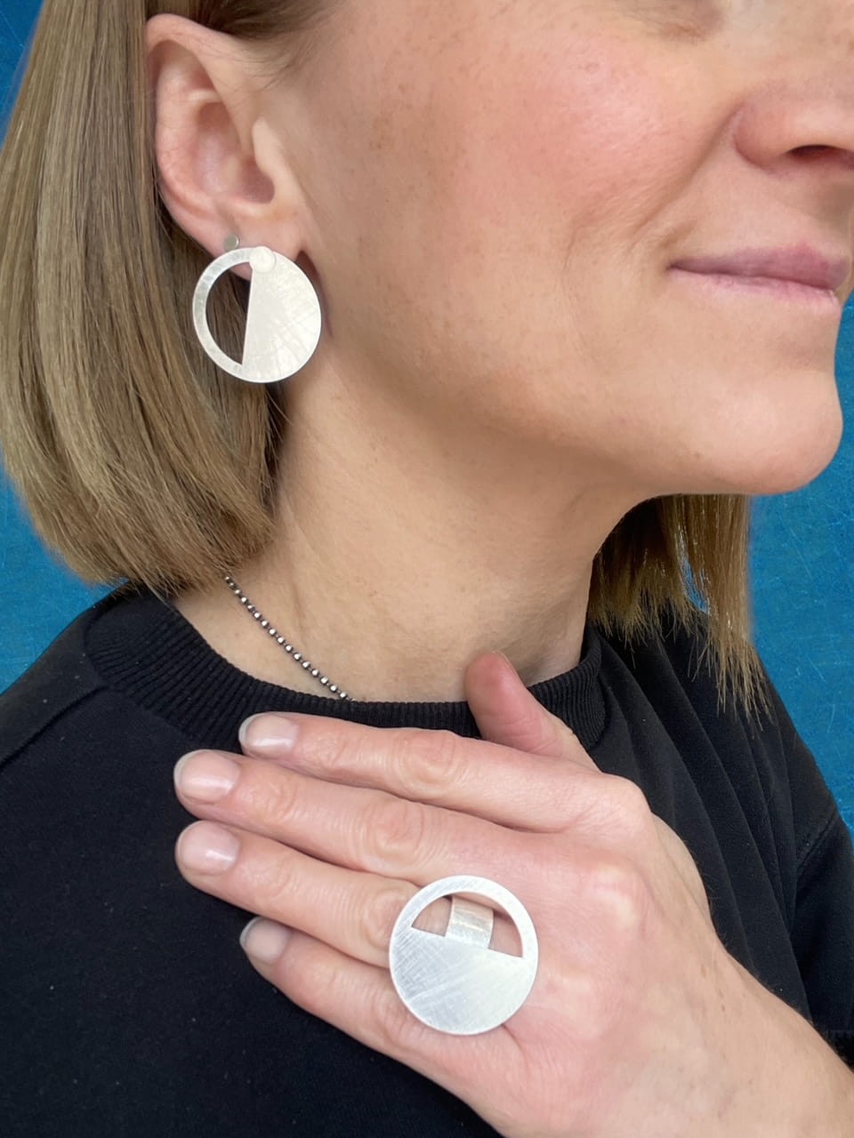 Duże, baaardzo lekkie, srebrne kolczyki o ciekawej, szczotkowanej powierzchni. Składają się z dwóch elementów- sztyftu zapinanego na baranek i okrągłej blaszki. Okrągły element można zakładać na płatek ucha lub pod płatek, dodatkowo można nosić sam sztyft.