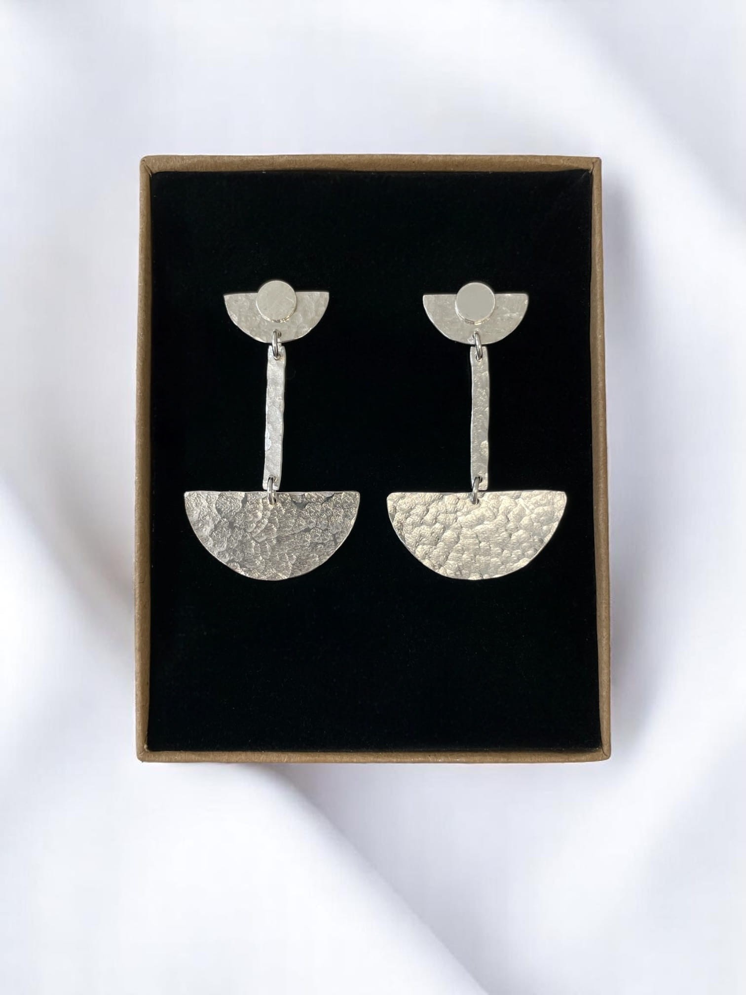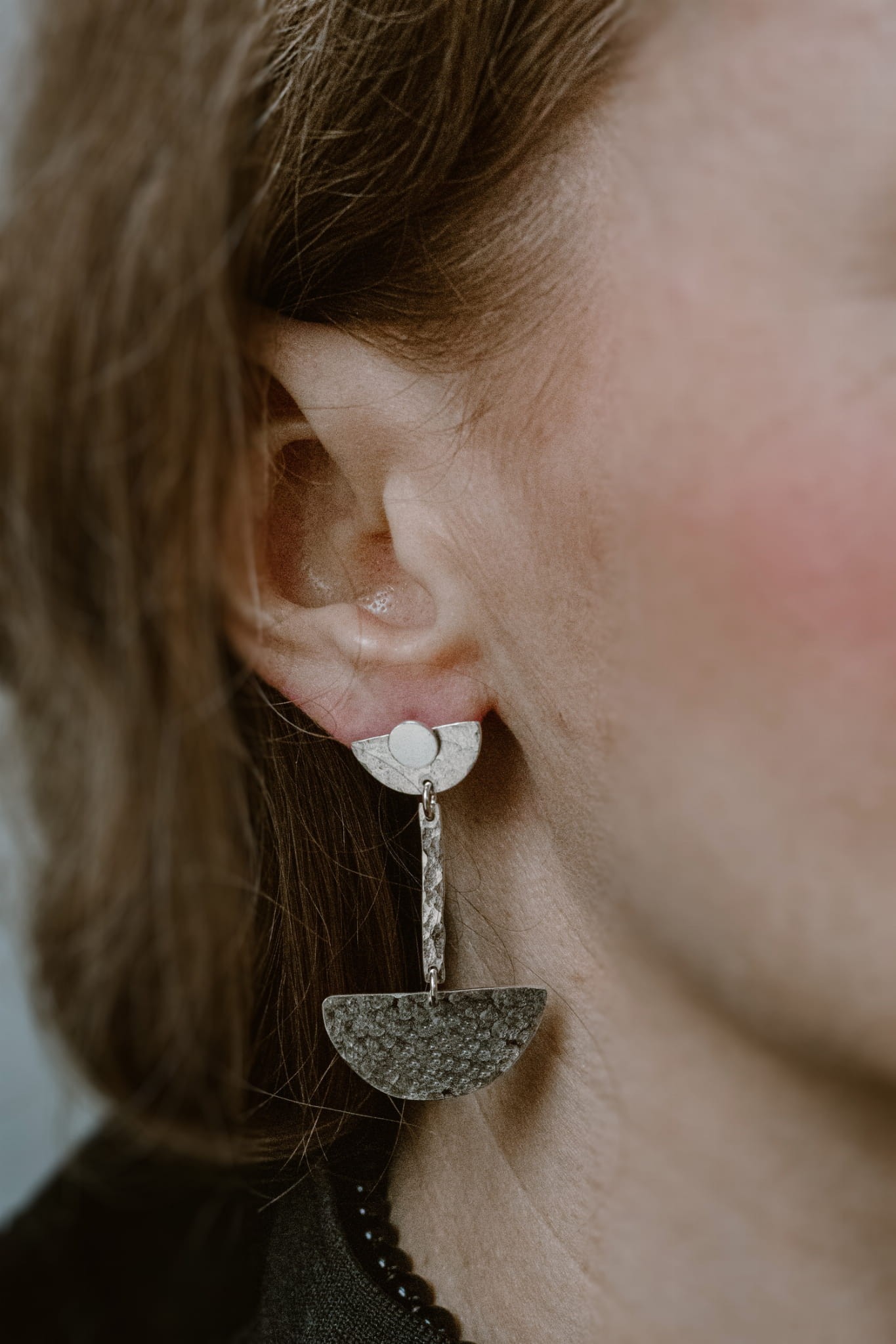 Delikatne, lekkie wiszące kolczyki wykonane ze srebra próby 925. Składają się z dwóch elementów: minimalistycznego sztyftu zapinanego na baranek oraz dwóch, ozdobnych, półokrągłych elementów połączonych ogniwkami.