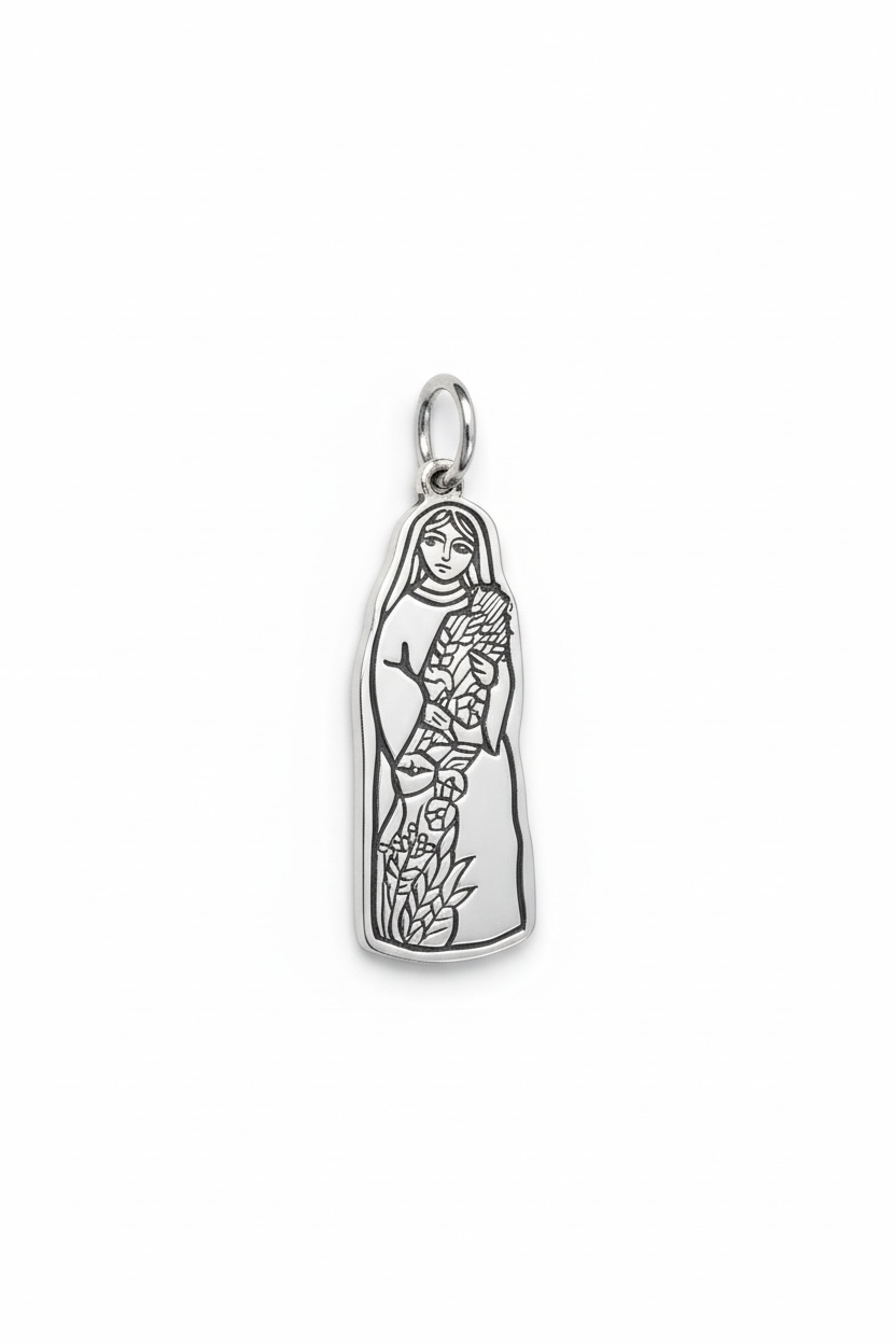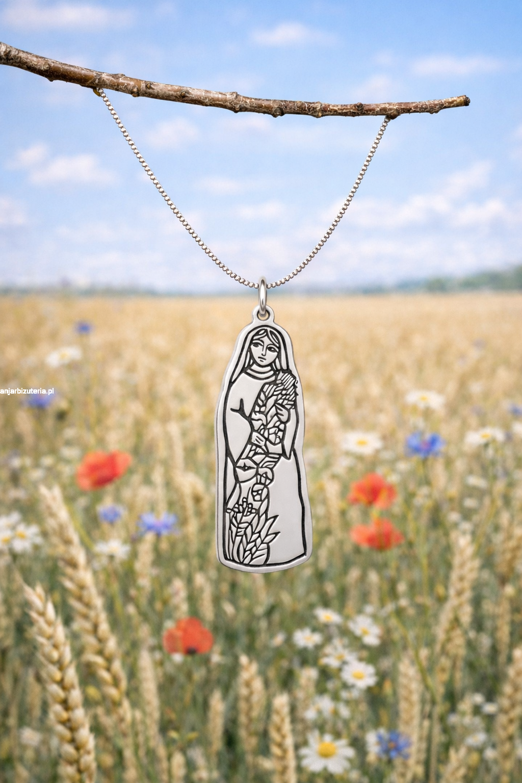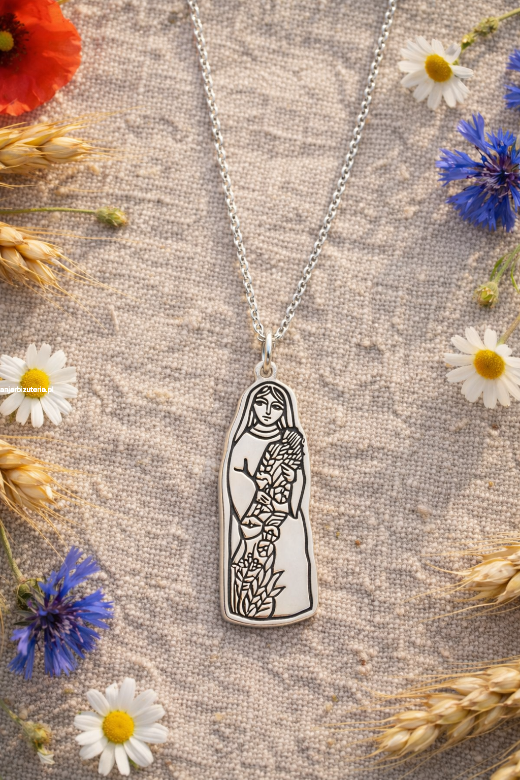 Srebrny medalik z wizerunkiem Matki Boskiej Zielnej, inspirowany polską sztuką ludową.