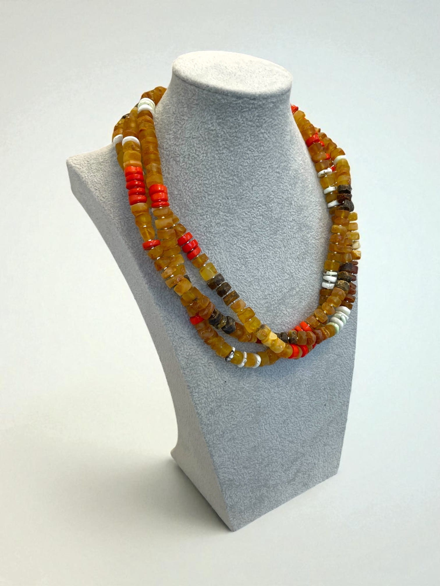 Naszyjnik z bursztynu bałtyckiego, koralowca, turkusu australijskiego i srebra.