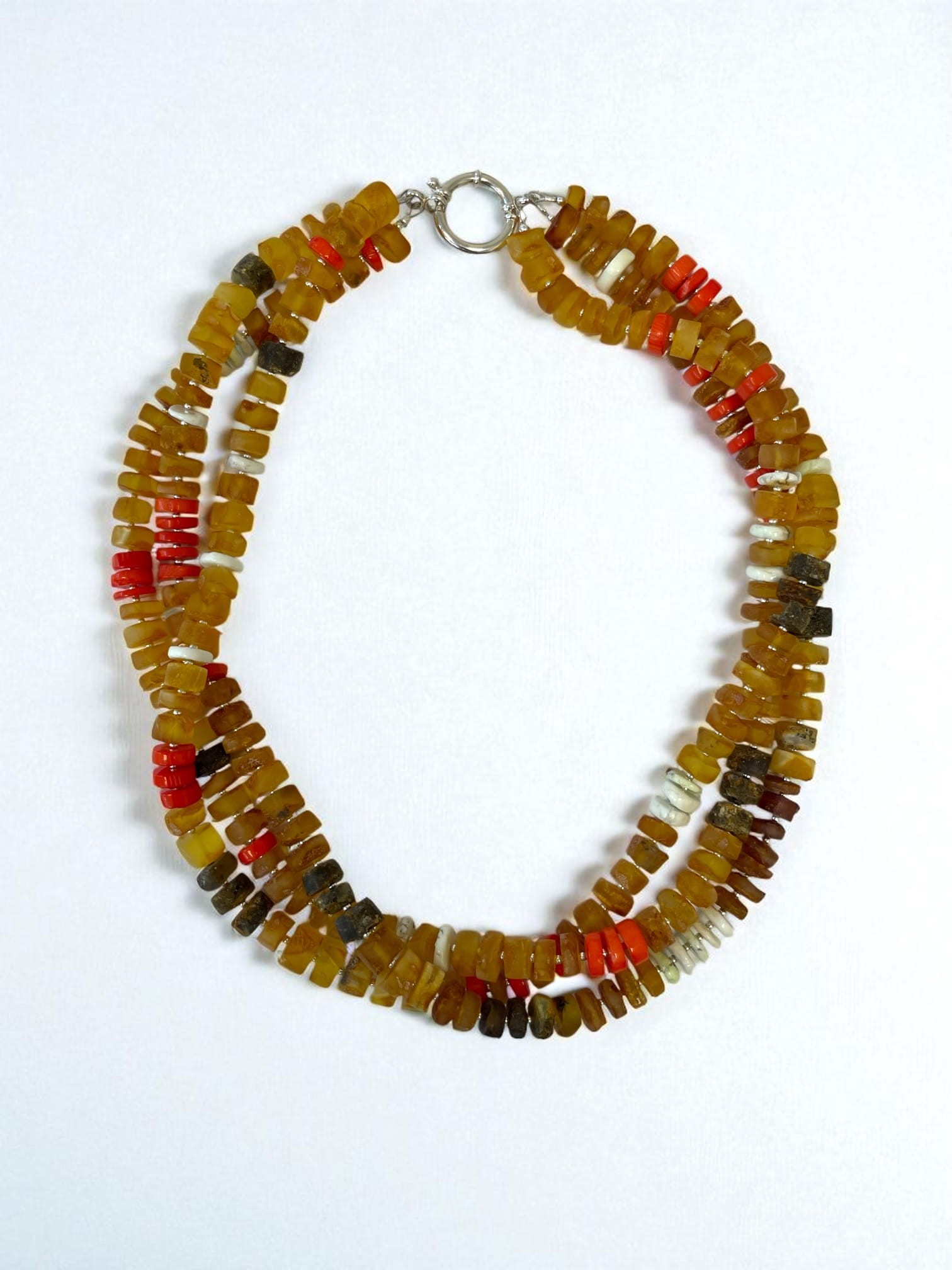 Powstał z trzech sznurów naturalnych kamieni: miodowego i czarnego bursztynu bałtyckiego, intensywnie pomarańczowego koralowca oraz jasnego turkusu australijskiego. Całość dopełniają srebrne elementy dodające blasku i elegancji.