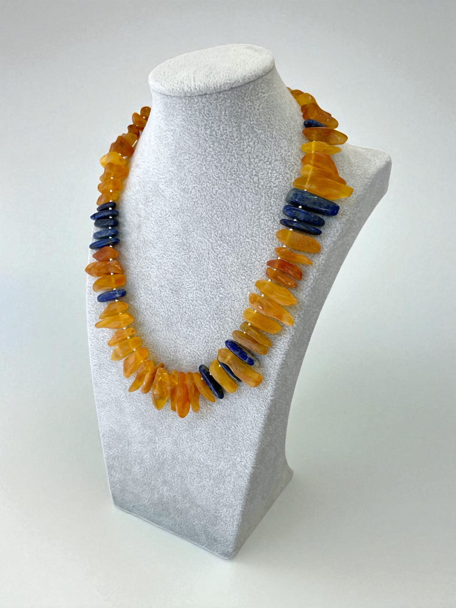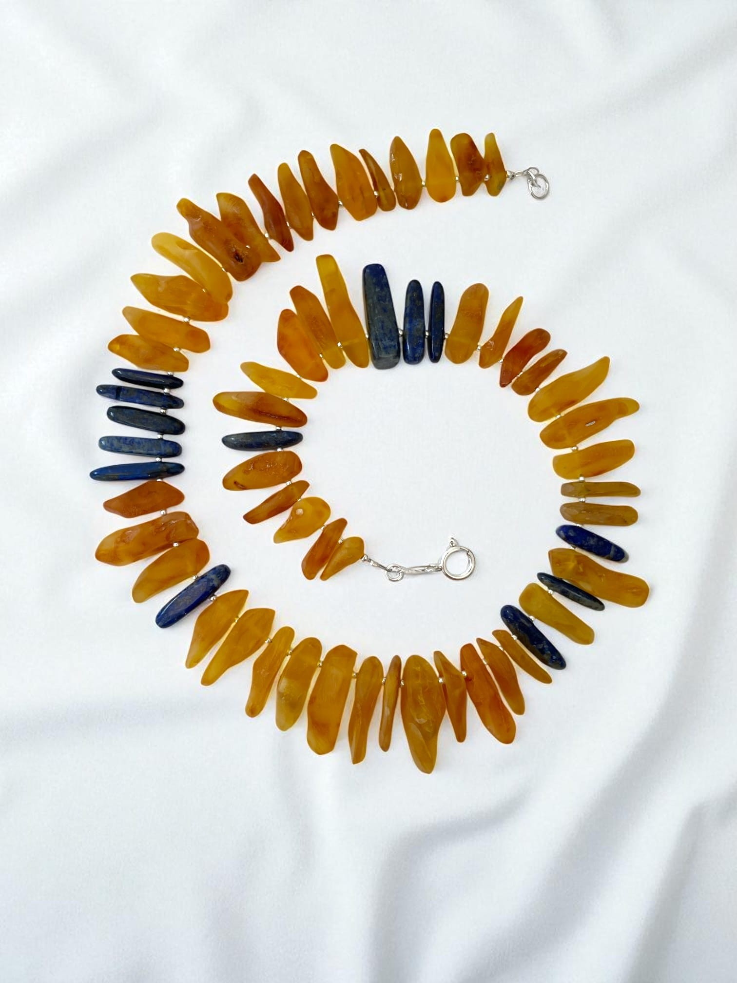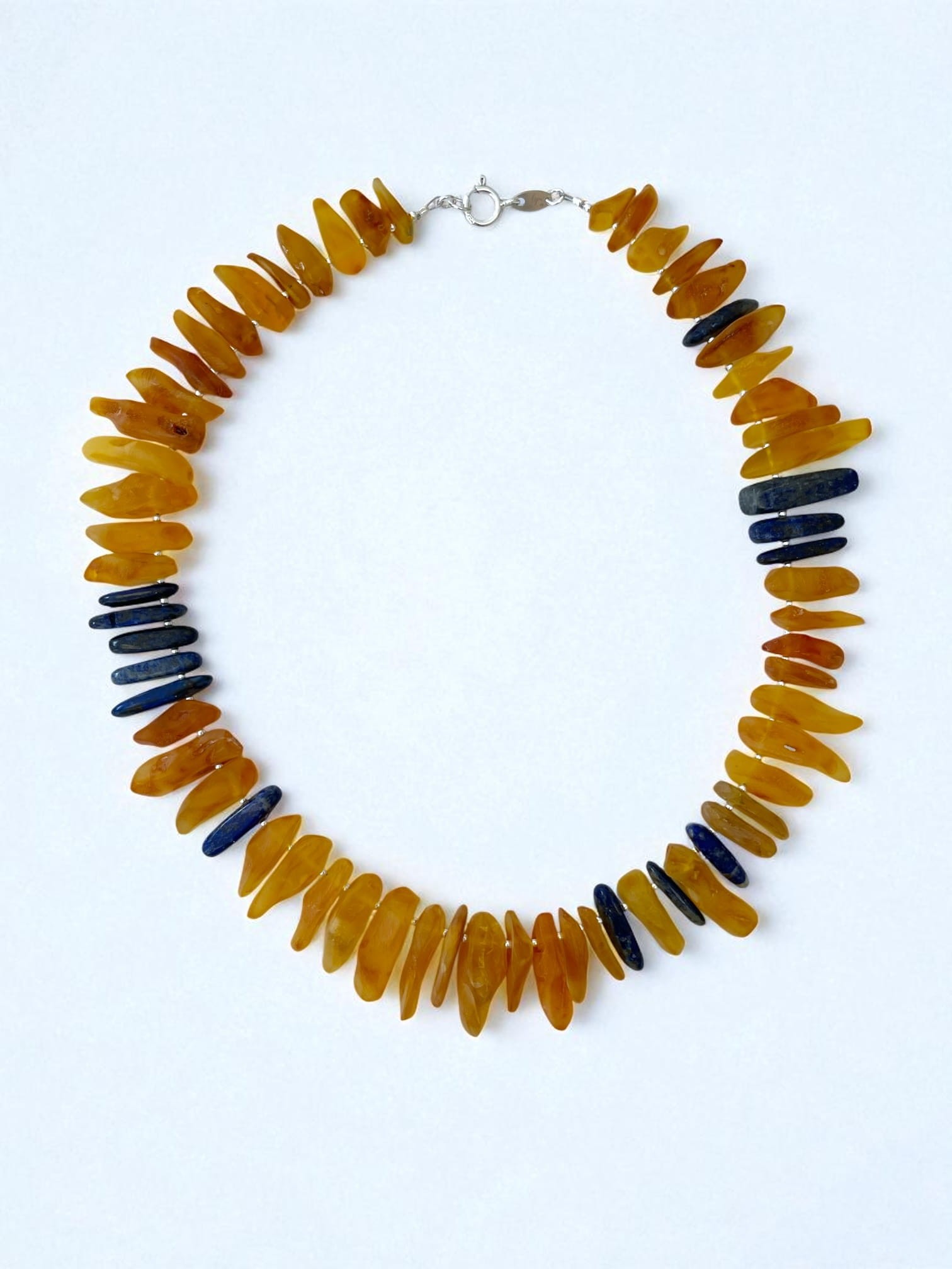 Ten wyjątkowy naszyjnik powstał z delikatnie oszlifowanych bryłek bursztynu bałtyckiego oraz intensywnie niebieskich kłów lapis lazuli.