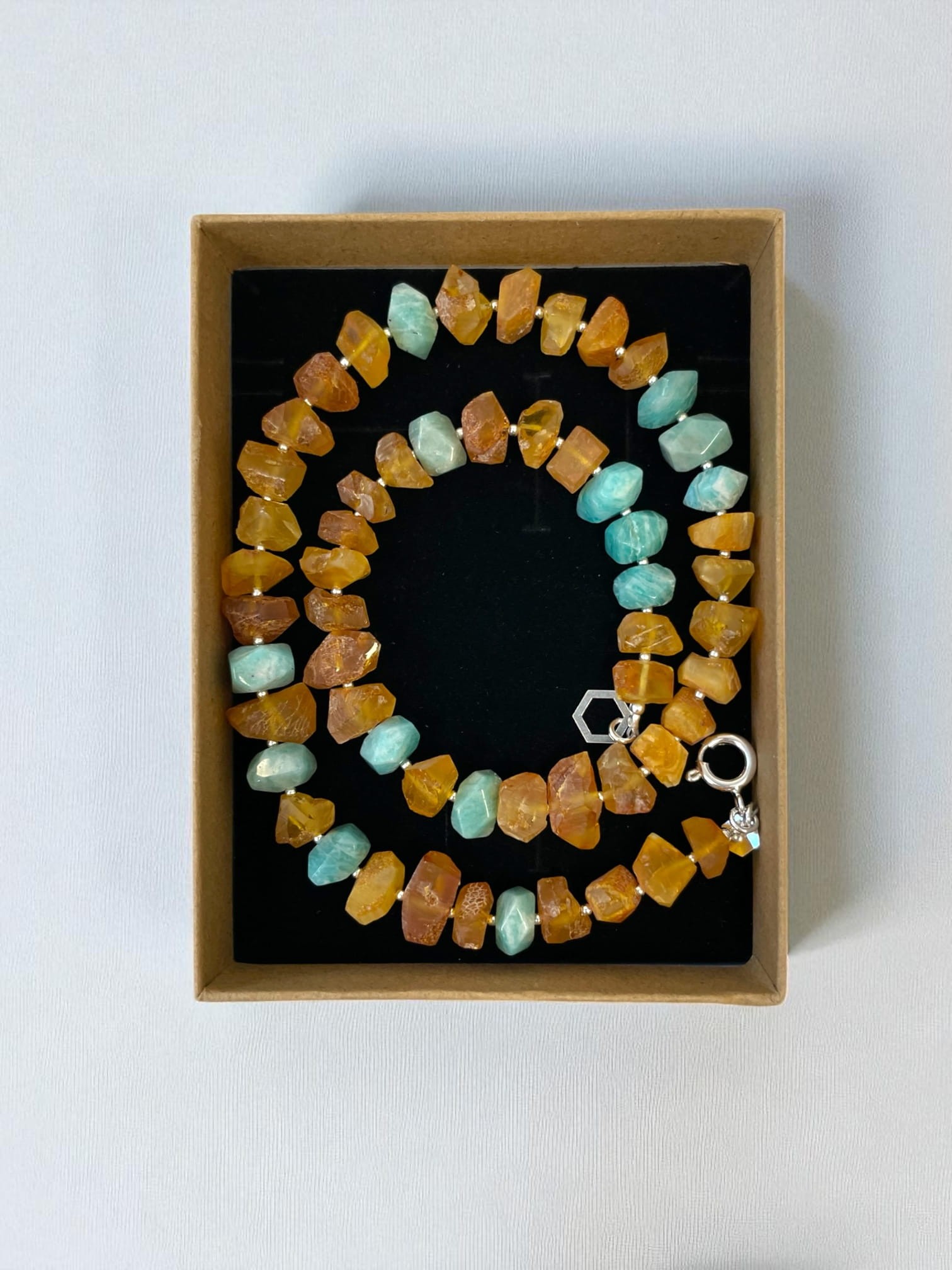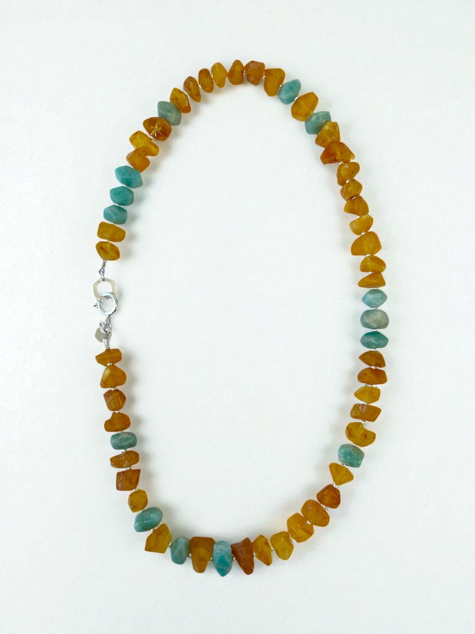 Ten wyjątkowy naszyjnik powstał z ręcznie szlifowanych bursztynów bałtyckich, którym nadaliśmy kształt kryształków. Ich złociste tony pięknie kontrastują z chłodnym seledynem amazonitu, tworząc harmonijne połączenie barw.