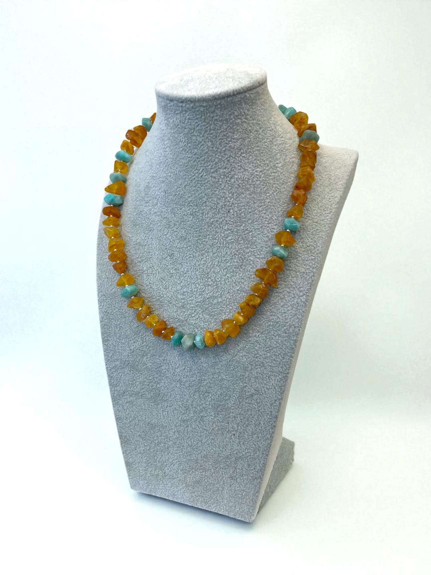 Naszyjnik „Ogień Północy” – bursztyn bałtycki, amazonit, srebro.
