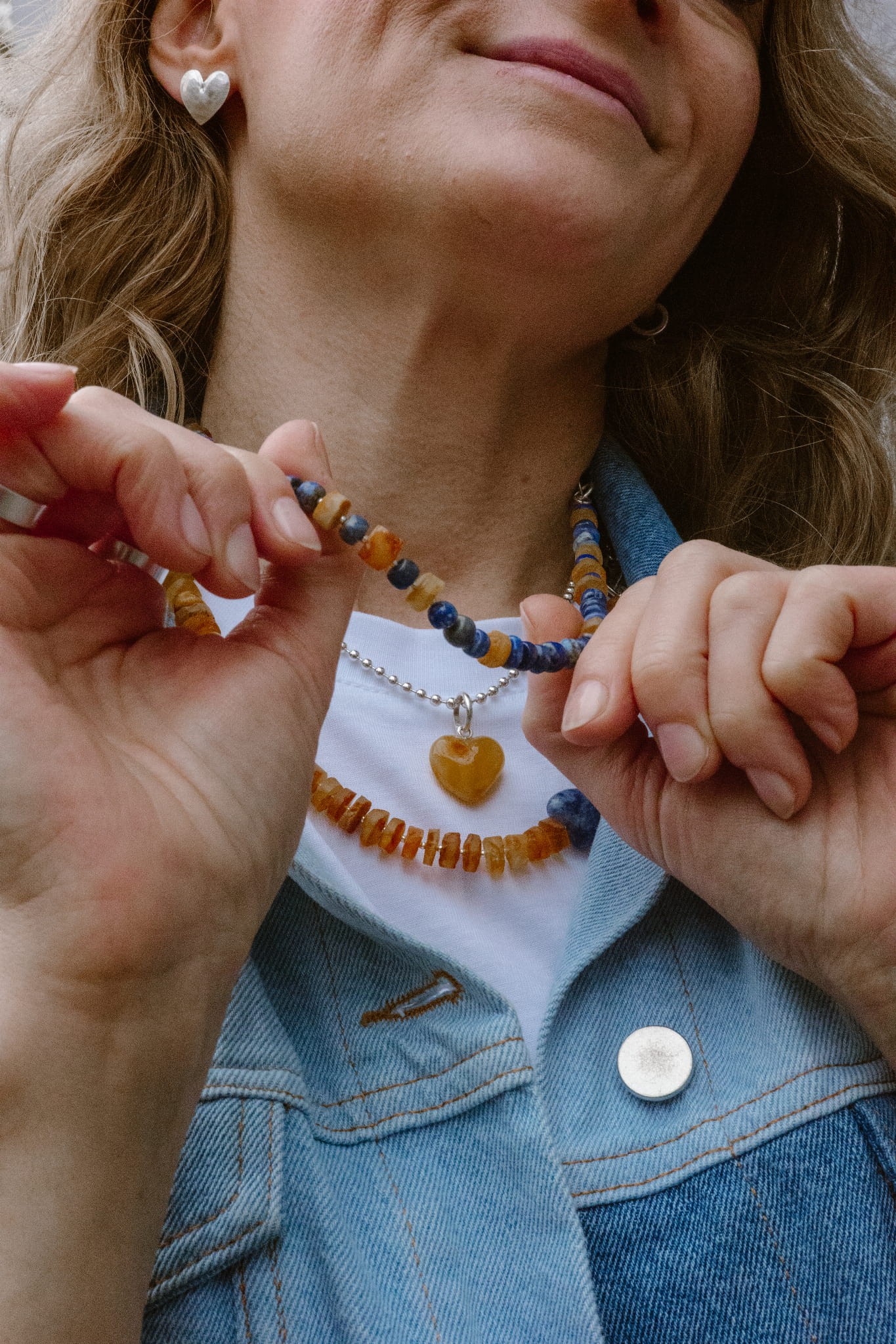 Wyjątkowy naszyjnik wykonany z nieregularnych bryłek lapis lazuli oraz delikatnie oszlifowanego, matowego bursztynu bałtyckiego. Kamienie zostały przełożone srebrnymi, polerowanymi kuleczkami, dzięki czemu całość układa się miękko i elegancko na dekolcie. Naszyjnik zapinany jest na klasyczne zapięcie typu federing wykonane ze srebra próby 925.