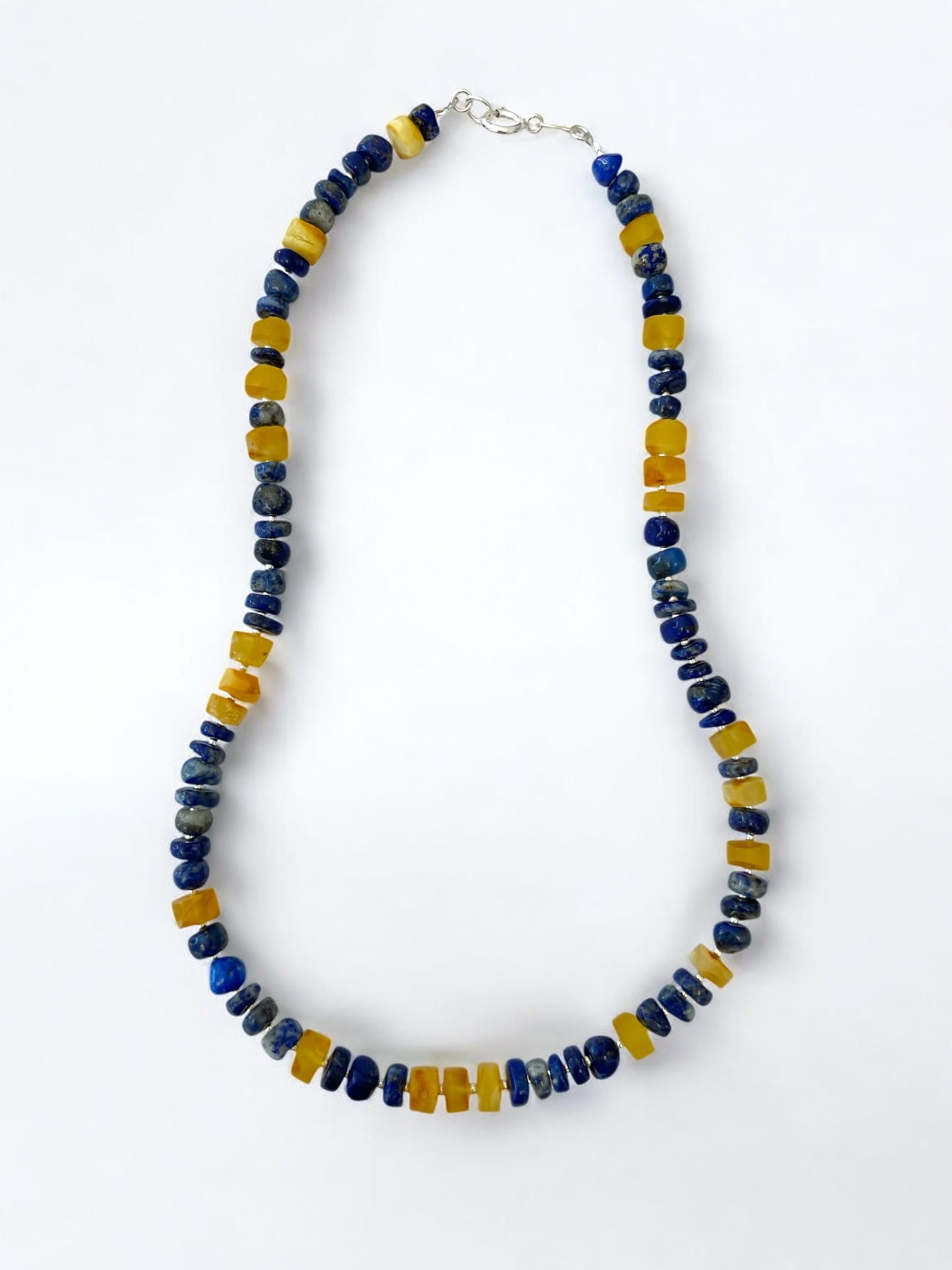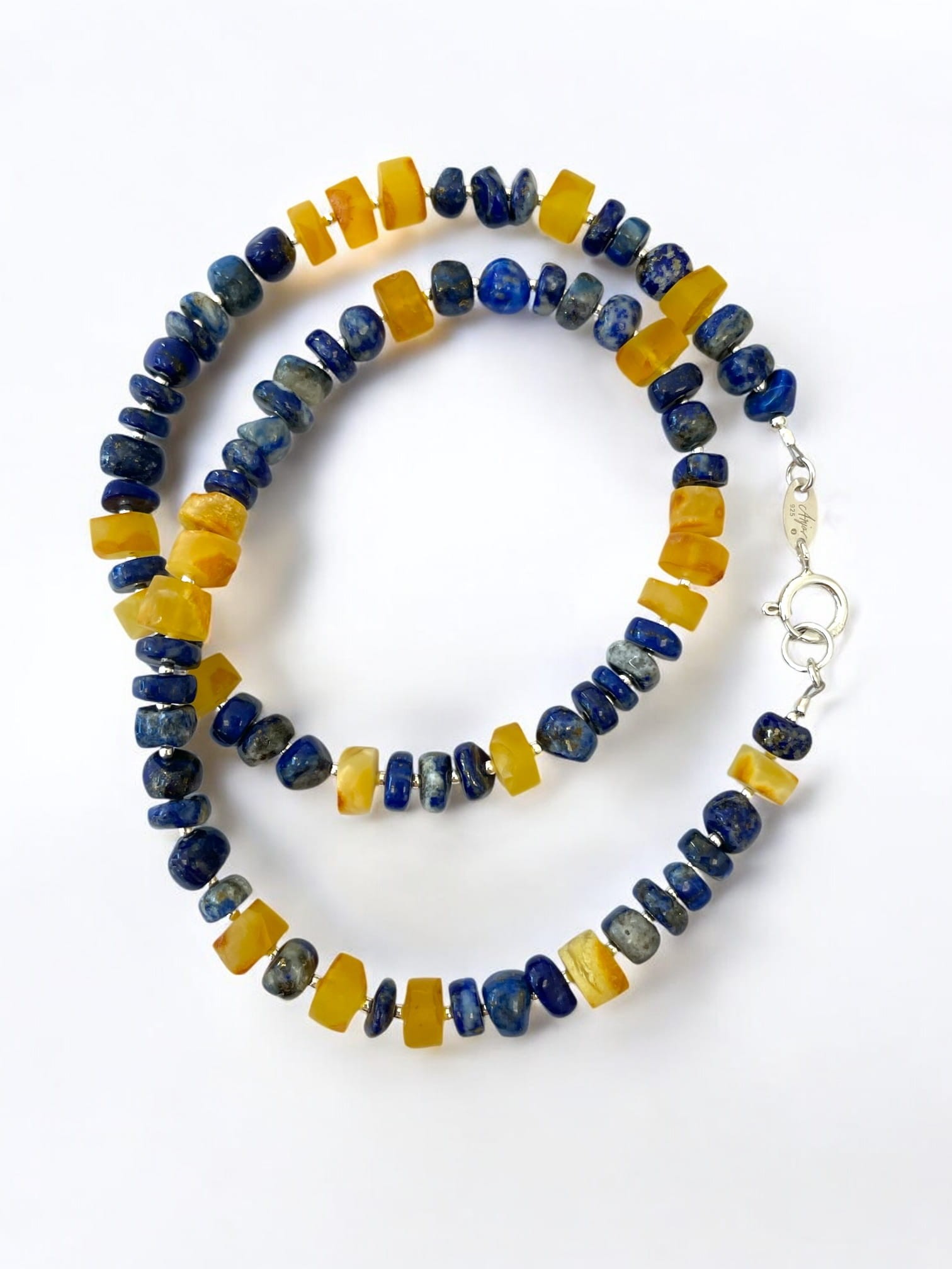 Wyjątkowy naszyjnik wykonany z nieregularnych bryłek lapis lazuli oraz delikatnie oszlifowanego, matowego bursztynu bałtyckiego.