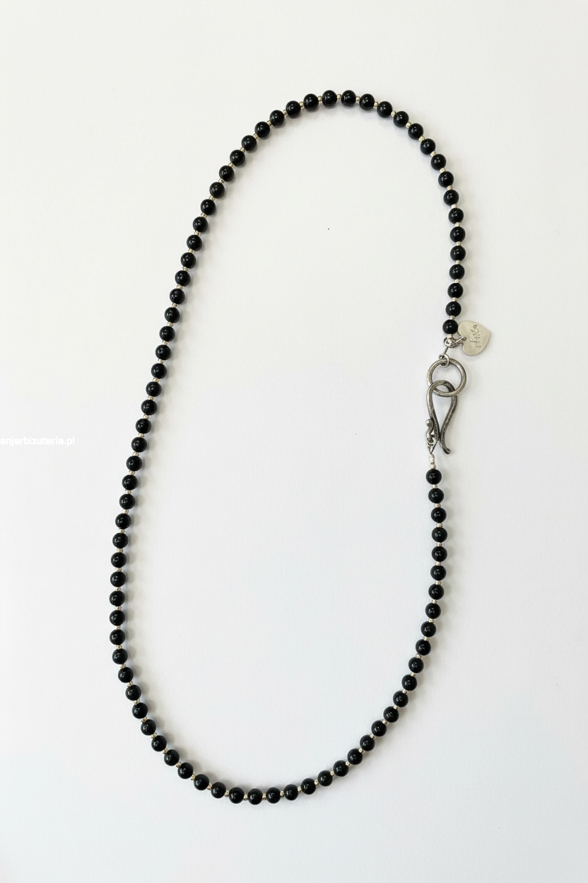 Elegancki, a zarazem wyrazisty – ten naszyjnik wykonany z polerowanych onyksów (średnica 6 mm) to propozycja dla osób ceniących ponadczasową klasykę z nutą artystycznego wyrazu. Całość wieńczy ręcznie wykonany haczyk ze srebra próby 925, młotkowanego i oksydowanego dla uzyskania unikalnego charakteru.