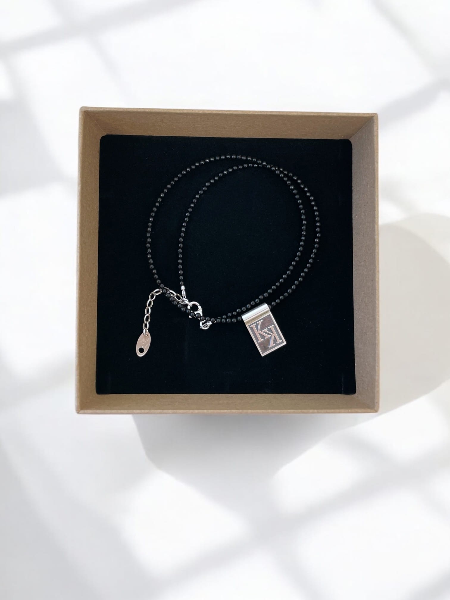 Elegancki, a jednocześnie bardzo osobisty naszyjnik wykonany z drobnych, czarnych kamieni naturalnych. Centralnym punktem jest prostokątna zawieszka ze srebra próby 925, na której umieszczone zostaną wybrane przez Ciebie inicjały.