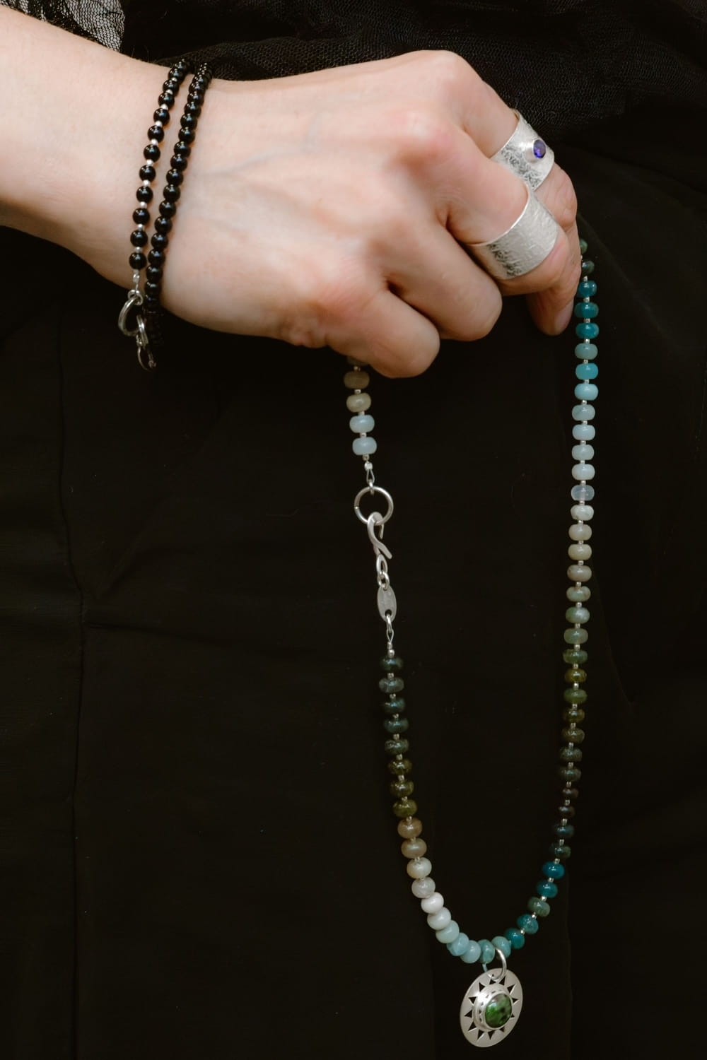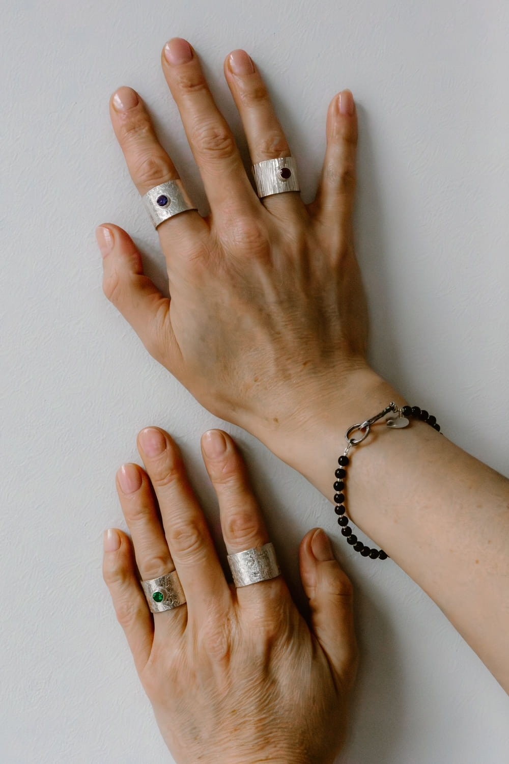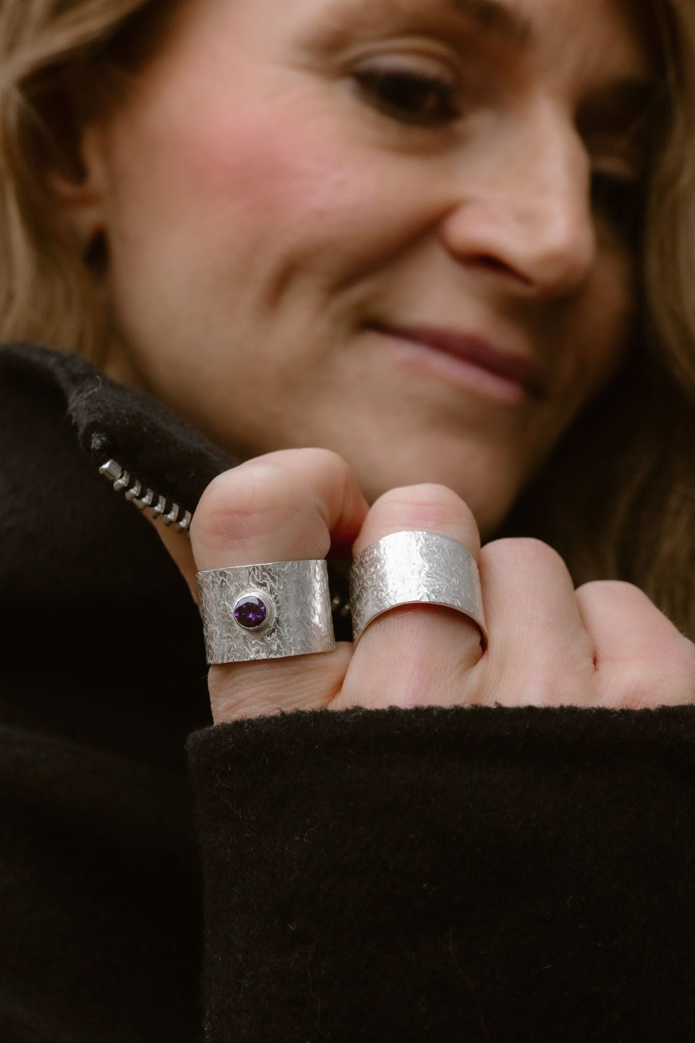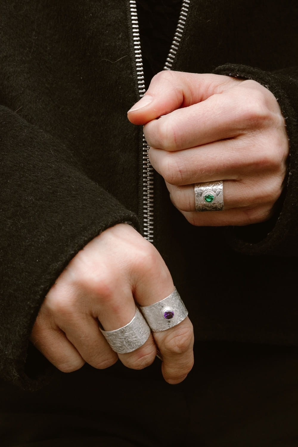Minimalistyczna forma i charakterystyczna faktura sprawiają, że obrączka „Kamień" przyciąga spojrzenia i doskonale komponuje się z inną biżuterią w stylu artystycznym.