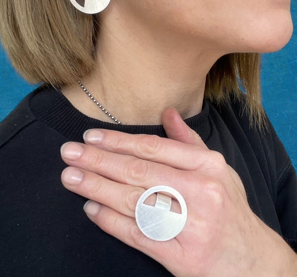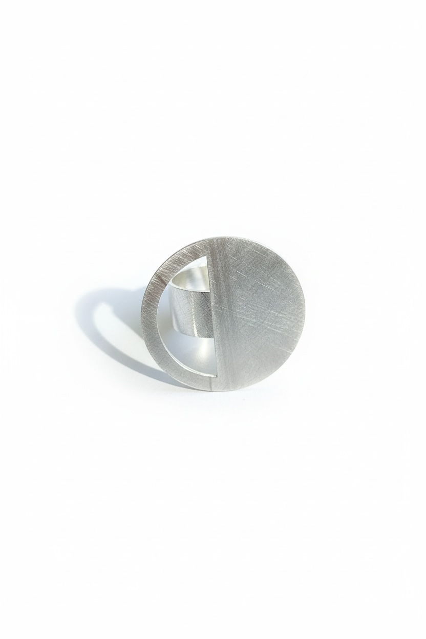 Duży, srebrny pierścionek o prostym, geometrycznym kształcie. Wykonany ze szczotkowanego srebra próby 925. Szeroka, stabilna obrączka doskonale utrzymuje okazałą tarczę pierścionka.