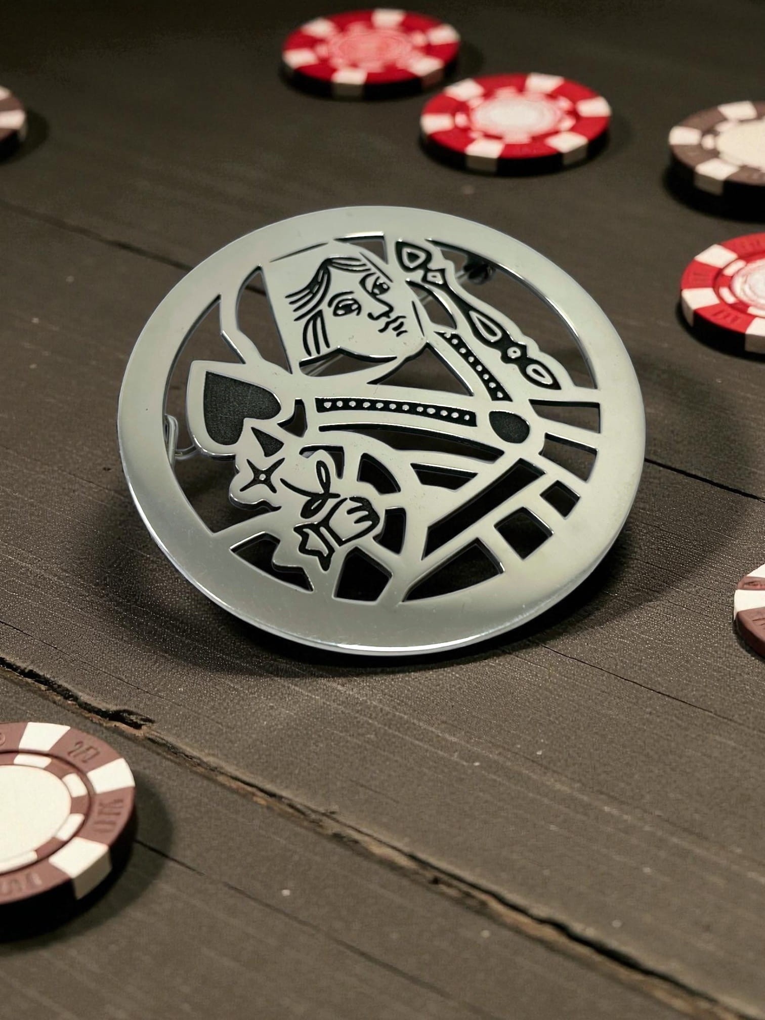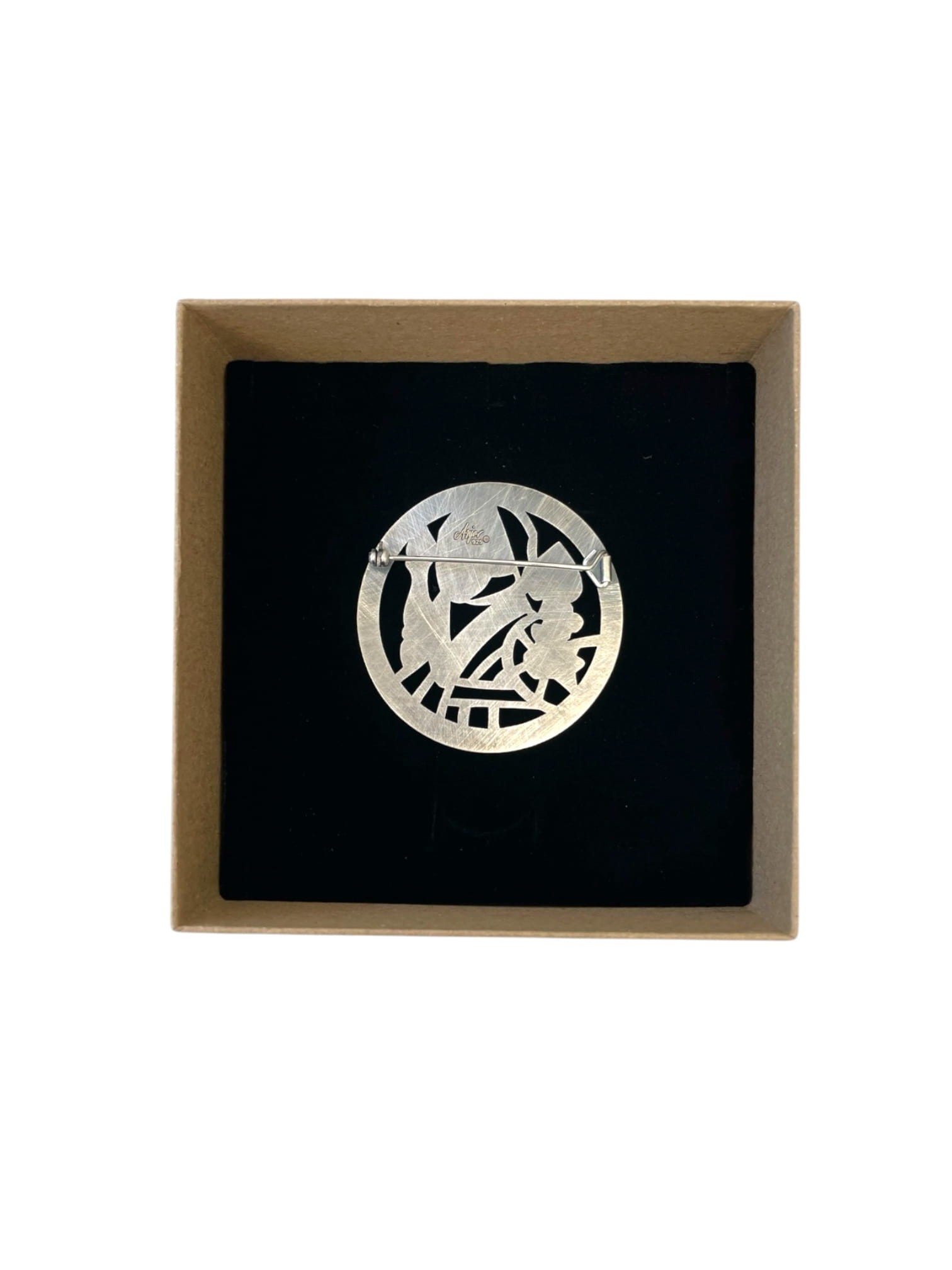 Wyjątkowa, ażurowa broszka o średnicy ok. 50 mm, wykonana ze srebra próby 925, oksydowanego i polerowanego, z grawerowanym wizerunkiem Damy pik.