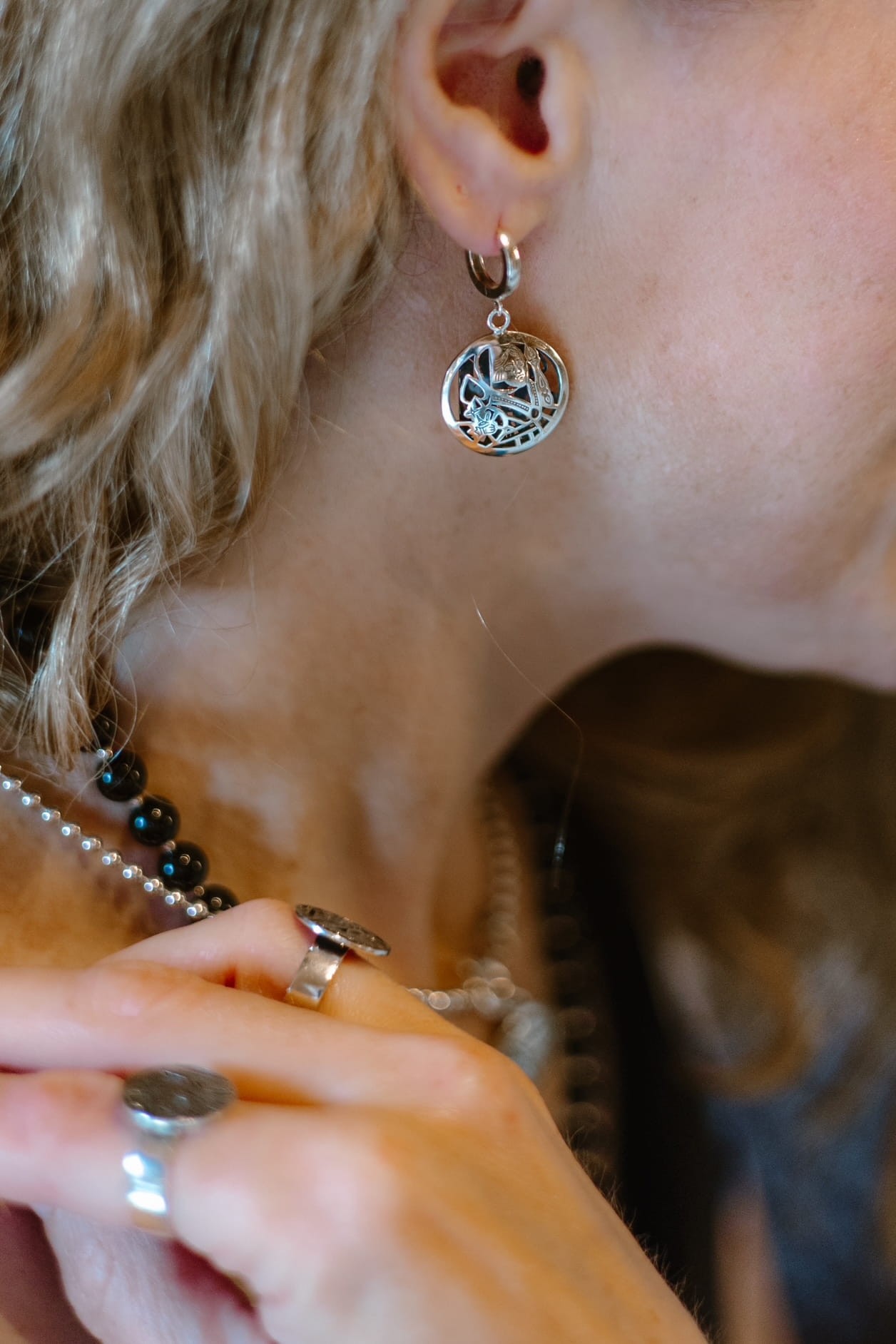 Wykonane ręcznie ze srebra próby 925, oksydowanego i polerowanego, zachwycają subtelnym kontrastem i głębią detali. Dzięki praktycznemu zapięciu kajdankowemu są wygodne i bezpieczne, a jednocześnie elegancko prezentują się na uchu.