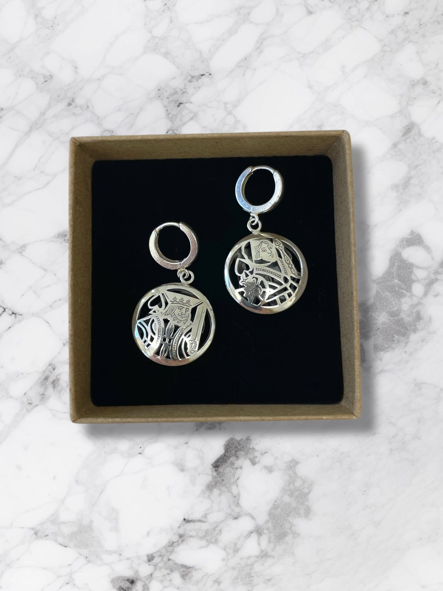 Kolczyki o unikalnej formie – mają kształt lekko wypukłej, dwustronnej pastylki. Tarcze zdobią wizerunki karcianych postaci – Damy i Króla pik. Średnica elementu to ok. 20 mm, co sprawia, że kolczyki są wyraziste, a jednocześnie wygodne w noszeniu.